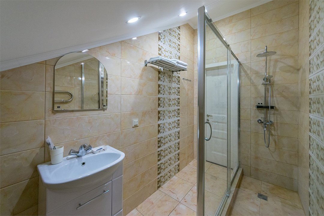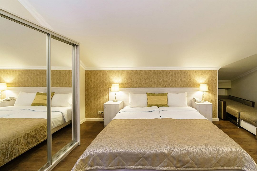 Wi-Fi, кондиционер, светильник, настольные лампы, фен, электронные замки, душевая кабина, банные полотенца, тапочки, гигиенические средства, кровать «Queen size», двуспальная кровать, две односпальные кровати, зеркало, унитаз, раковина, питьевая вода, душ, вид на город, вид во двор, стаканы, стул, стол, тумба, внутренний телефон, мини-холодильник, шкаф-купе, мансардные окна, можно с питомцамиВ гостиничном номере