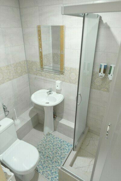 С/у в номере, душевая кабина, туалетные принадлежности, приветственный набор (чай, конфеты, сушки) и набор посуды.