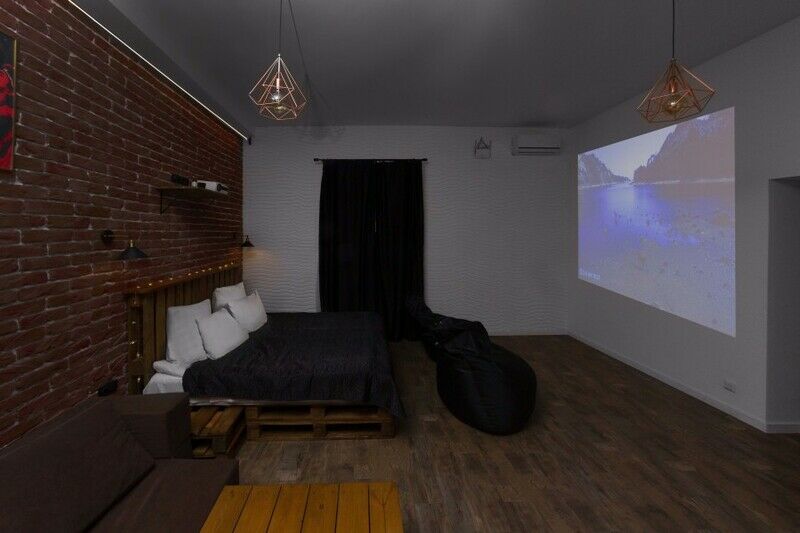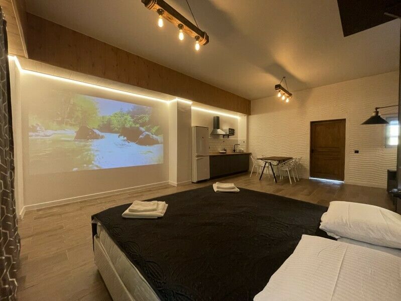 В номере двуспальная кровать King size + раскладной диван, кухня, проектор для просмотра фильмов