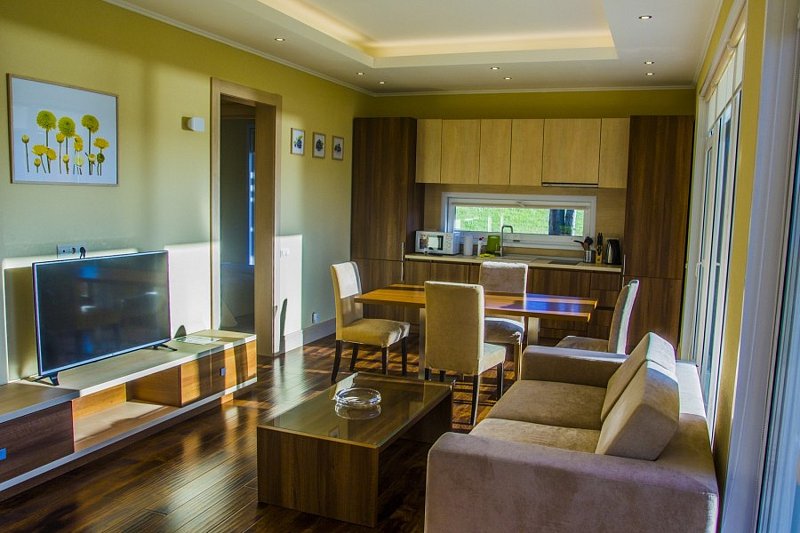 Уютная гостиная со столовой зоной и полностью оборудованной кухней (чайник, холодильник, плита, микроволновая печь, посудомоечная машина), три спальные комнаты, две ванные комнаты.