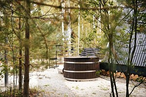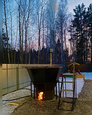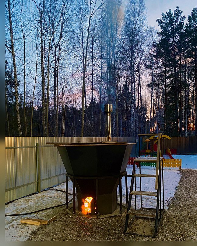 Фурако — это кедровая деревянная купель с горячей водой, вода в которой подогревается с помощью дровяной печи до температуры 40-42 градуса