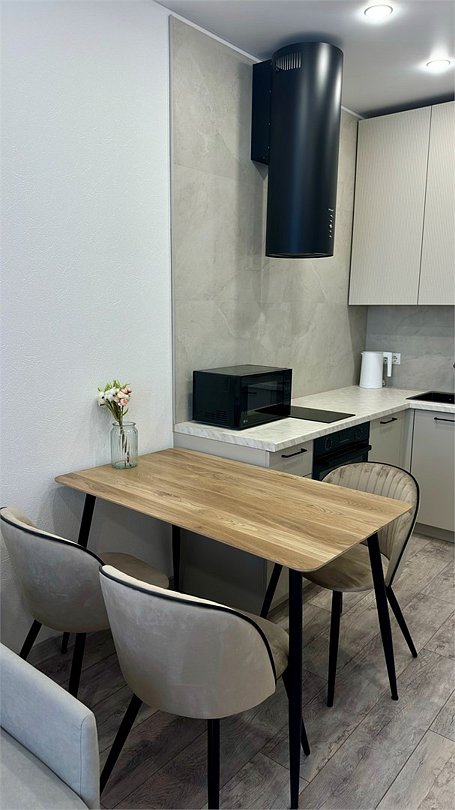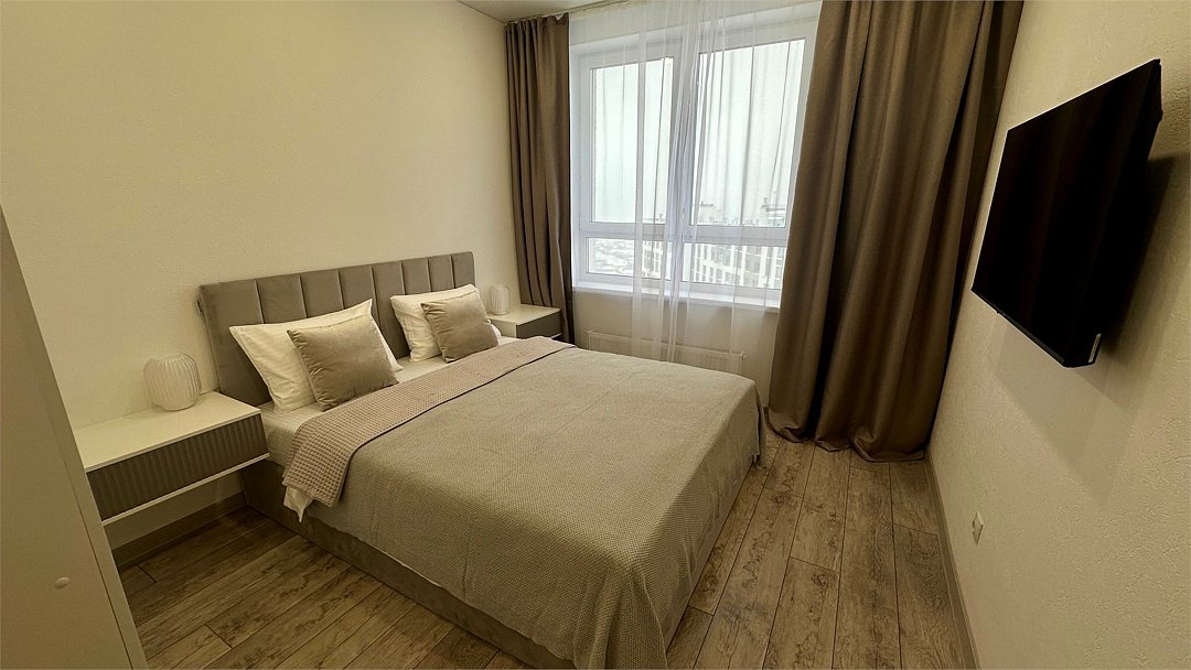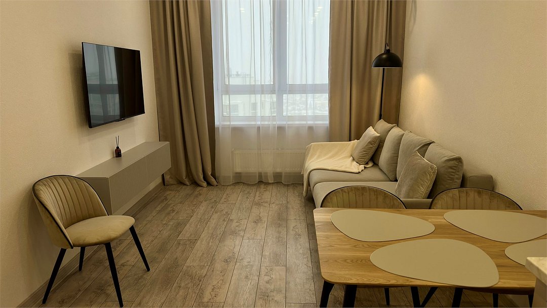 Уютная квартира, где все продумано до мелочей Насладиться отдыхом даже если вы приехали по делам. Уютная квартира формата 1+, где все продумано до мелочей: большая кровать с ортопедическим матрасом и мягким постельным бельем позволит выспаться и набраться сил, взбодриться под утренним горячем душем, улыбнуться себе в зеркало, сварить чашечку кофе ☕️ и насладиться солнечными лучами, глядя в огромные окна в пол - чудесное начало дня, правда? Вечером можно включить торшер и насладиться чтением книг в тишине или посмотреть интересный фильм на большом экране. Для вашего удобства в ванной комнате расположена стиральная и сушильная машины, фен. На кухне есть вся необходимая посуда и техника: капельная кофеварка бренда melitta, свч, варочная панель и духовой шкаф, вместительный холодильник. В летнюю жару спасёт кондиционер. Побывав здесь один раз - вам точно захочется вернуться снова. Есть возможность арендовать с паркингом. При заселении взимается залог в размере 3 000р. Скидка на длительный срок. При проживании от 7 суток и более скидка 5% При проживании от 14 суток и более скидка 10% ⚠️Заселение только по предъявлению ПАСПОРТА. ⛔️ Апартаменты не сдаются для вечеринок и мероприятий. Проживание с животными запрещено. Расчетный час: 15:00-12:00Услуги и удобства
