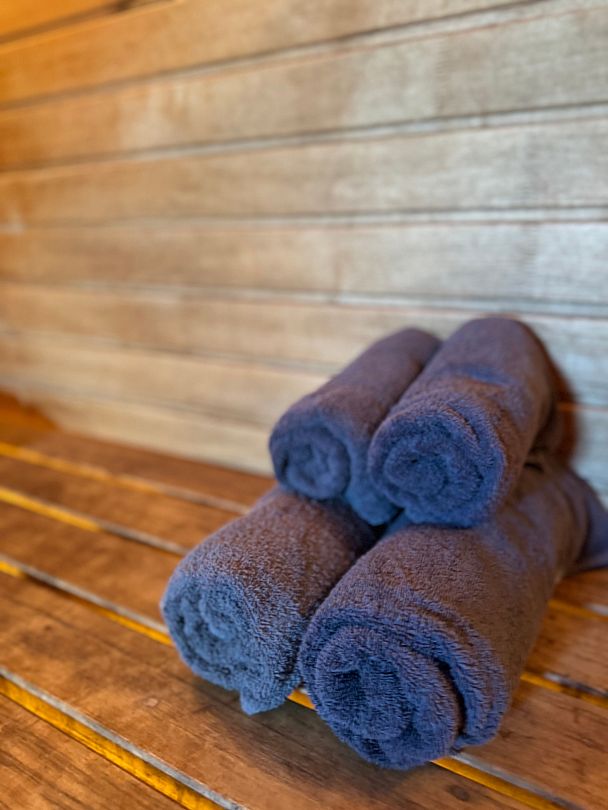Инфраструктура: полотенца, шапочки, обливное ведроВ сауне современная электропечка, очень удобная в использовании. Не надо колоть дрова, следить за температурой-нажал на кнопочку и все — температура будет держаться, пока Вы пользуетесь сауной.