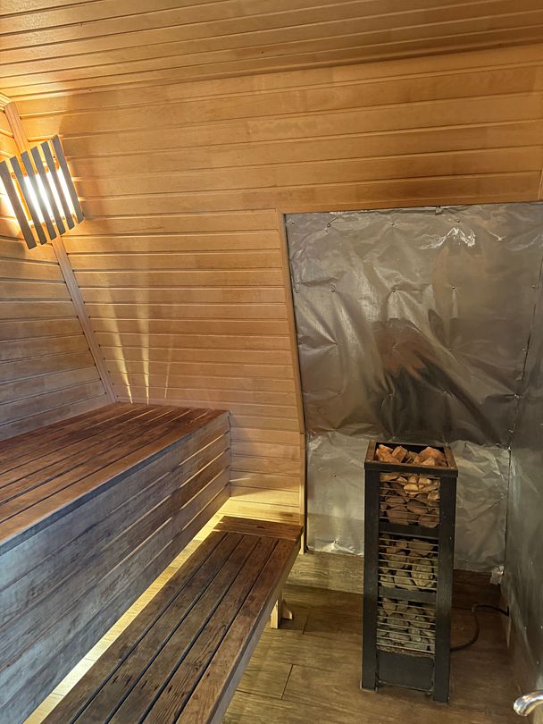 В сауне современная электропечка, очень удобная в использовании. Не надо колоть дрова, следить за температурой-нажал на кнопочку и все- температура будет держаться пока Вы пользуетесь сауной.