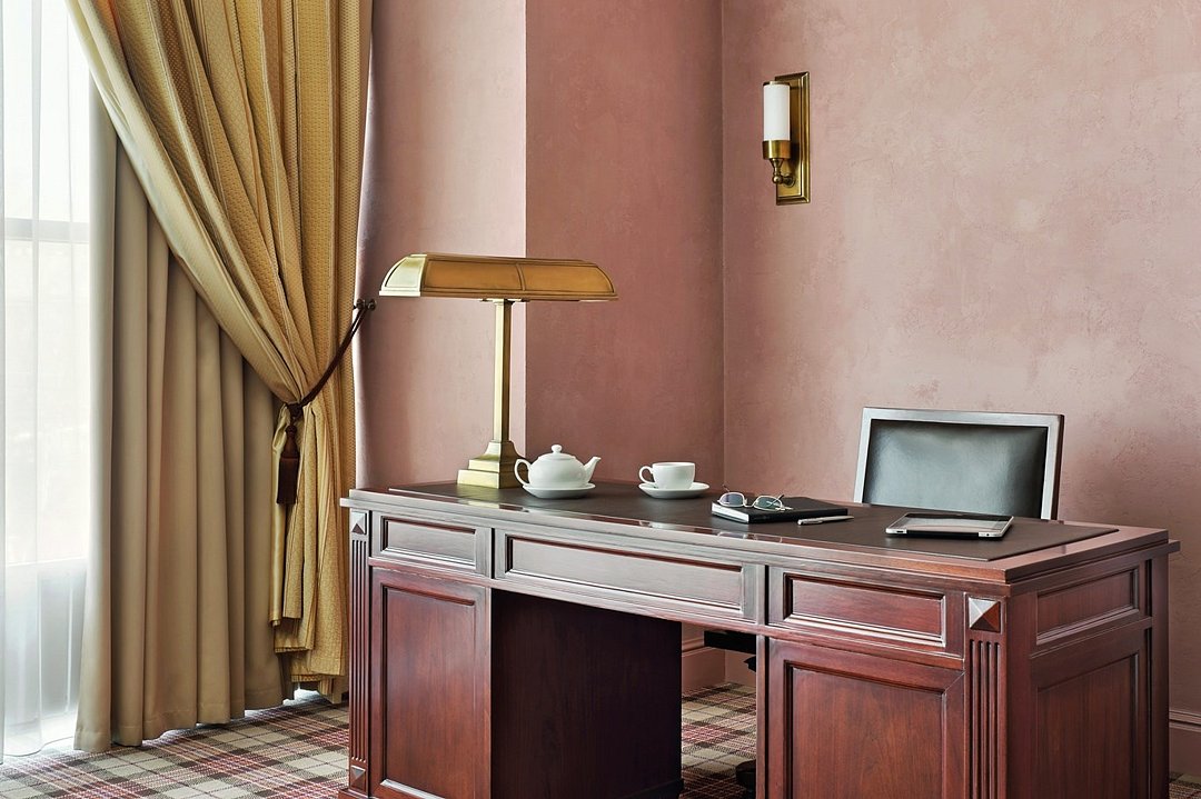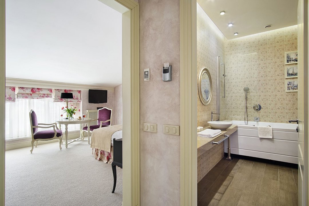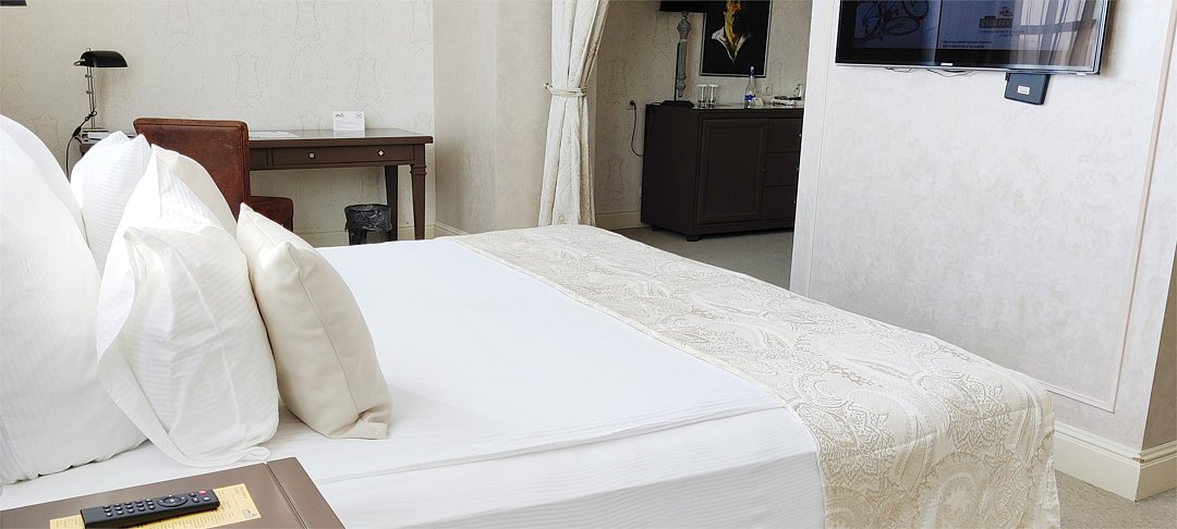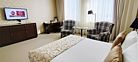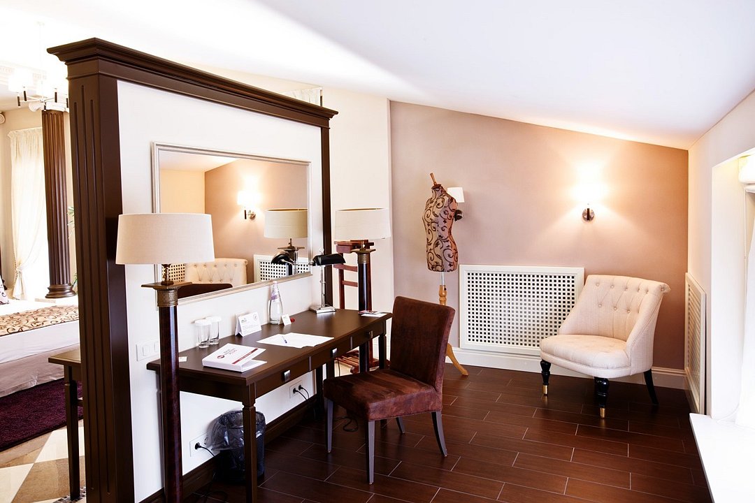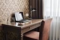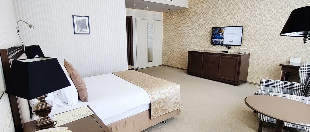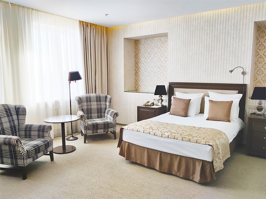 Элегантный интерьер номера площадью 25-35 кв. м оформлен в спокойных теплых тонах. Номер обставлен мебелью из натурального дерева в благородном классическом стиле, что делает его пространство презентабельным и комфортным. Выделена зона отдыха с двумя креслами и столом, за которым можно наслаждаться приятным чаепитием с пирожными из собственной кондитерской. Отдельная рабочая зона позволит с комфортом решить все необходимые дела. Расслабиться и набраться сил можно в просторной ванне. В номере имеется кровать с ортопедическим матрасом, ЖК телевизор, кондиционер, телефон. Всем гостям предоставляются белоснежные махровые халаты и тапочки. Мини-бар оснащен системой автоматического начисления. В любое время доступны услуги прачки.Услуги и удобства