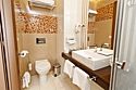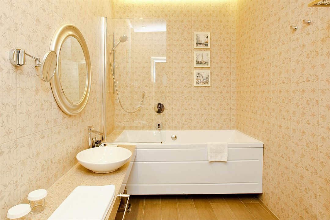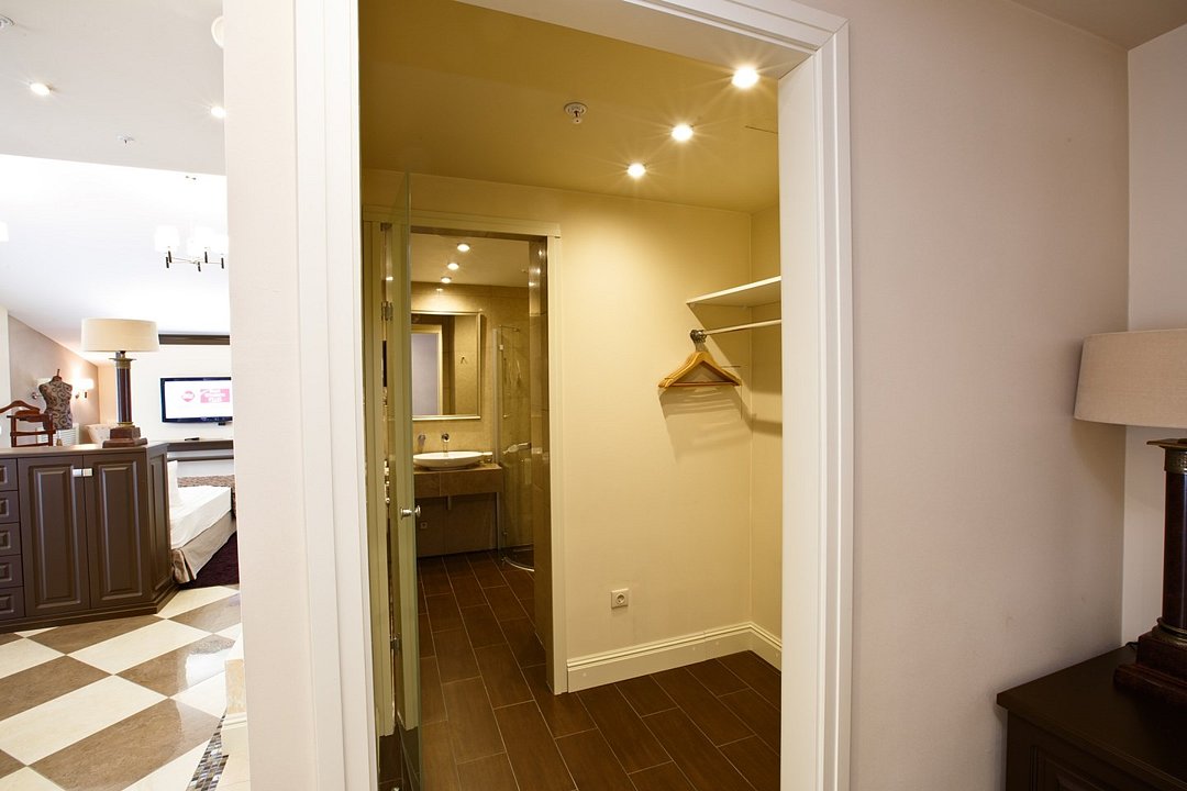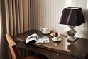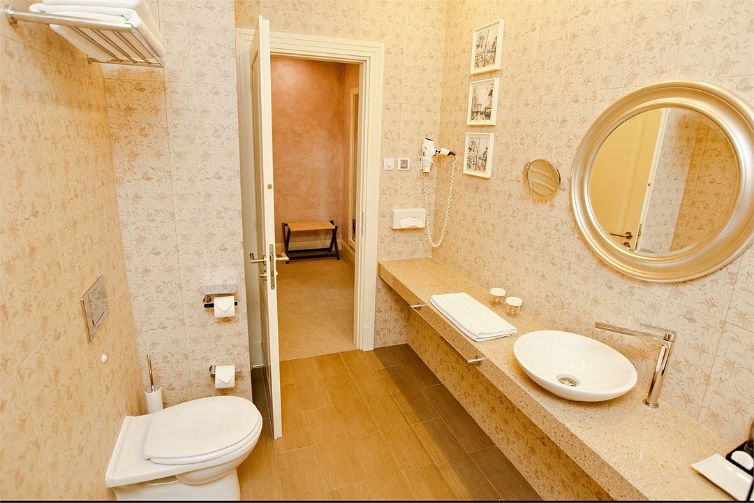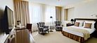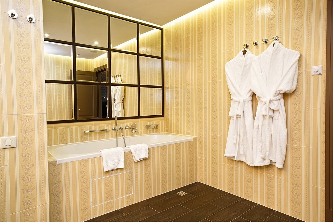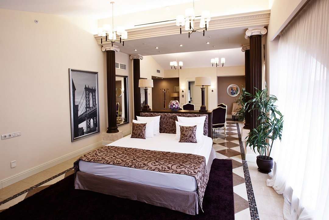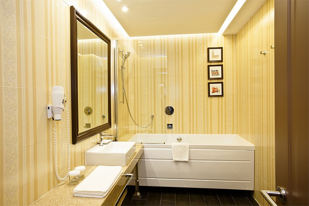 Элегантный интерьер номера площадью 25-35 кв. м оформлен в спокойных теплых тонах. Номер обставлен мебелью из натурального дерева в благородном классическом стиле, что делает его пространство презентабельным и комфортным. Выделена зона отдыха с двумя креслами и столом, за которым можно наслаждаться приятным чаепитием с пирожными из собственной кондитерской. Отдельная рабочая зона позволит с комфортом решить все необходимые дела. Расслабиться и набраться сил можно в просторной ванне. В номере имеется кровать с ортопедическим матрасом, ЖК телевизор, кондиционер, телефон. Всем гостям предоставляются белоснежные махровые халаты и тапочки. Мини-бар оснащен системой автоматического начисления. В любое время доступны услуги прачки.Услуги и удобства