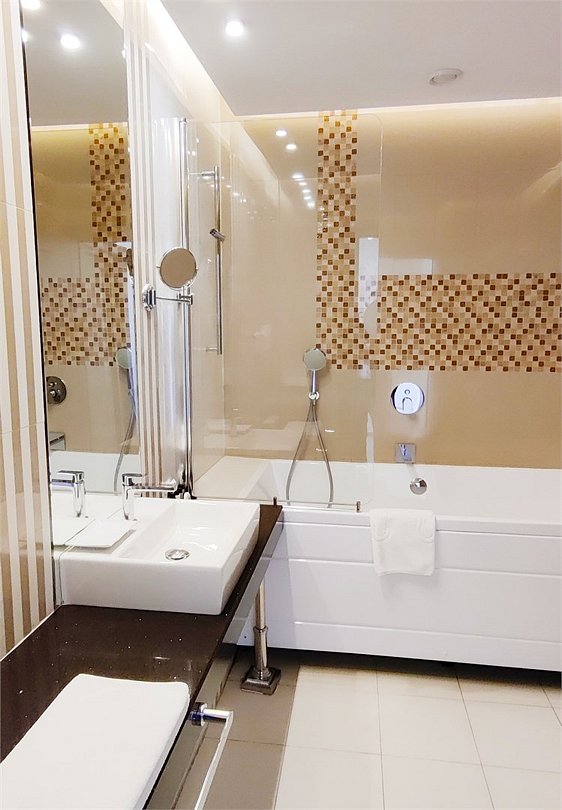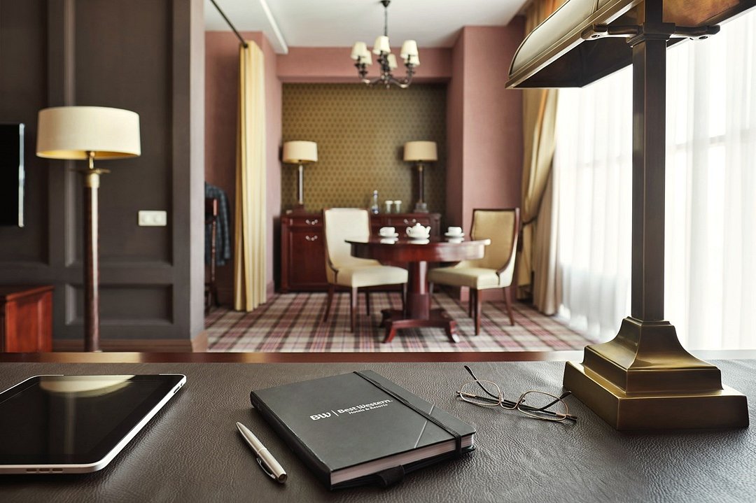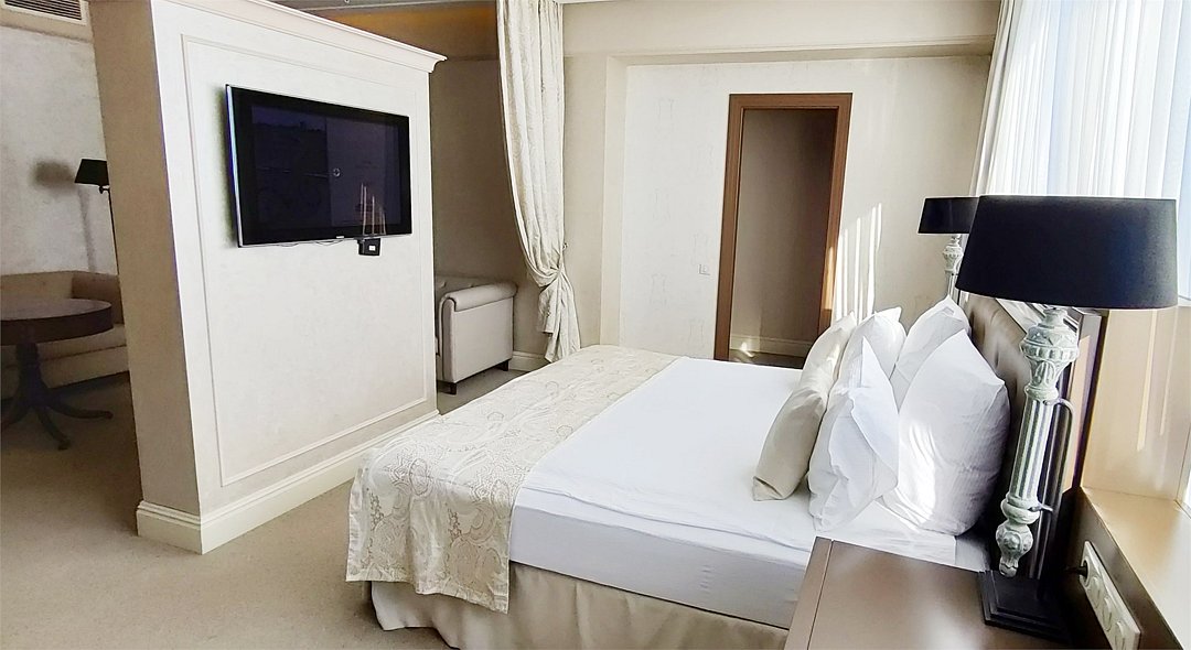 Представительский номер открывает гостям максимально широкие возможности как для комфортабельного отдыха, так и для полноценного решения деловых вопросов. Просторное светлое помещение с панорамными окнами оформлено в благородных теплых пастельных оттенках и оригинально декорировано. В номере организованы спальная зона, гостиная для проведения встреч, собеседований или переговоров, а так же оборудован отдельный рабочий кабинет. Особо широкая двуспальная кровать оснащена ортопедическим матрасом, предлагается меню подушек. Ванная комната оборудована душевой. Всем гостям предоставляются белоснежные махровые халаты, тапочки, расширенный набор косметических средств. Мини-бар оснащен системой автоматического начисления.Услуги и удобства