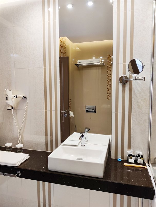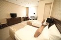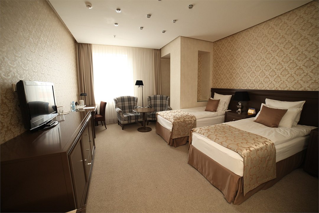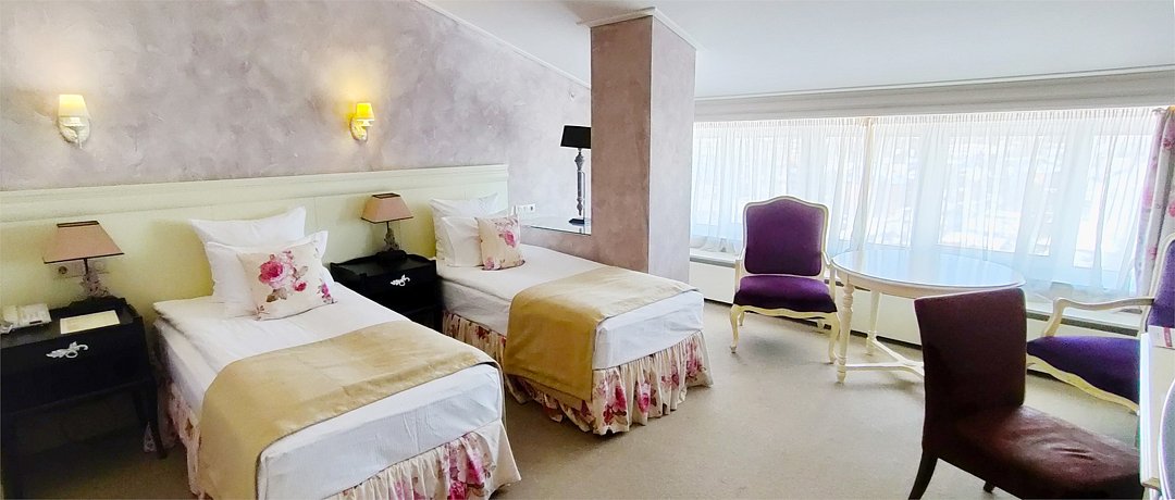 Просторный 2-х местный номер с 2-мя односпальными кроватями позволит комфортно разместиться, не нарушая личное пространство каждого гостя. Площадь номеров от 25 до 35 кв. м и продуманная обстановка обеспечивают идеальные условия проживания. Номер включает полноценную зону отдыха, пространство для работы и ванную комнату с косметическими принадлежностями. В вашем распоряжении – две кровати с удобными матрасами, затемняющие шторы, телефон с междугородной и международной связью, бесплатный Интернет, ЖК-телевизор с кабельным телевидением, бар и сейф. Интерьер выдержан в спокойных, теплых тонах. Вся мебель выполнена в классическом стиле, в каждом номере есть зеркало в полный рост. Гармоничное сочетание текстиля и отделки различных структур и фактур создают теплую и уютную атмосферу. Всем гостям по желанию предоставляются мягкие махровые халаты и тапочки. Для любителей средиземноморского стиля, есть номера с отделкой и текстилем легких, воздушных тонов, цветочным рисунком и светлой мебелью.Услуги и удобства