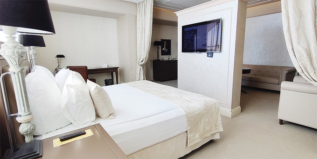 Отличные возможности для приятного отдыха и решения деловых вопросов предоставляют номера категории Люкс. Интерьер оформлен в благородных теплых пастельных оттенках, что создаёт особую атмосферу роскоши и изысканности. Вся мебель представлена в элегантном классическом стиле, отличающемся стройными изгибами, резным декором и утончённостью исполнения. В выделенной просторной зоне отдыха расположены мягкий диван, аккуратные кресла и удобный столик. В номере имеется два санузла, что позволяет с комфортом разместить несколько человек. Всем гостям предоставляются махровые халаты, тапочки, косметические средства. Пространство номера разделено на зону отдыха и гостиную, в который вы можете проводить деловые встречи и собеседования. Рабочее пространство имеет все необходимые условия для успешного ведения дел и решения важных вопросов. Двуспальная кровать с ортопедическим матрасом позволит хорошо выспаться приступить к решению деловых задач. Панорамные окна открывают прекрасный вид на заречную часть города и Мост Влюбленных.Услуги и удобства