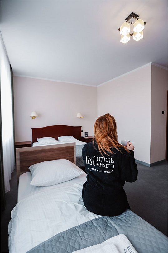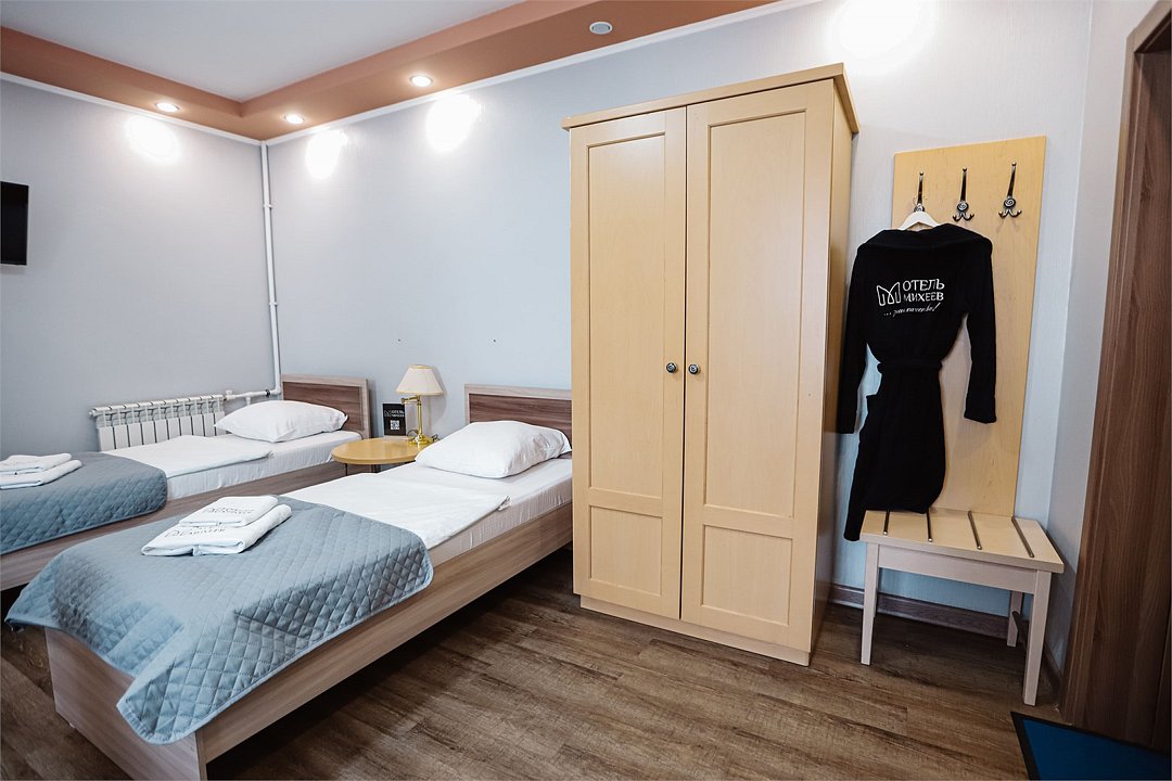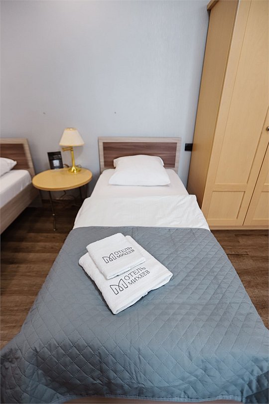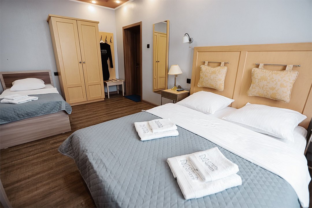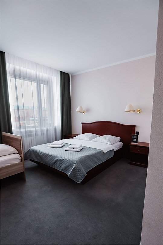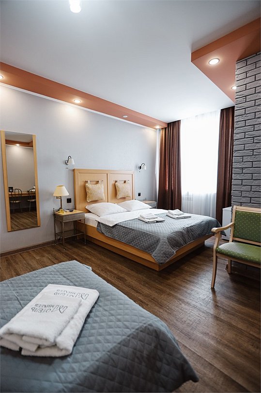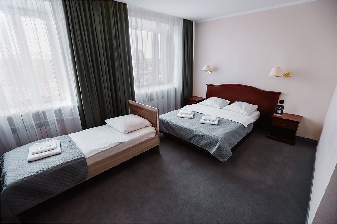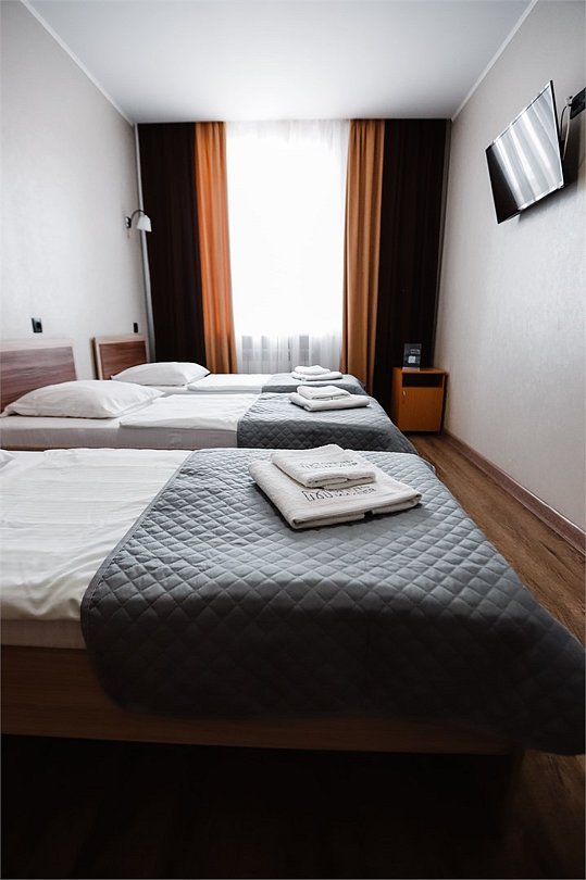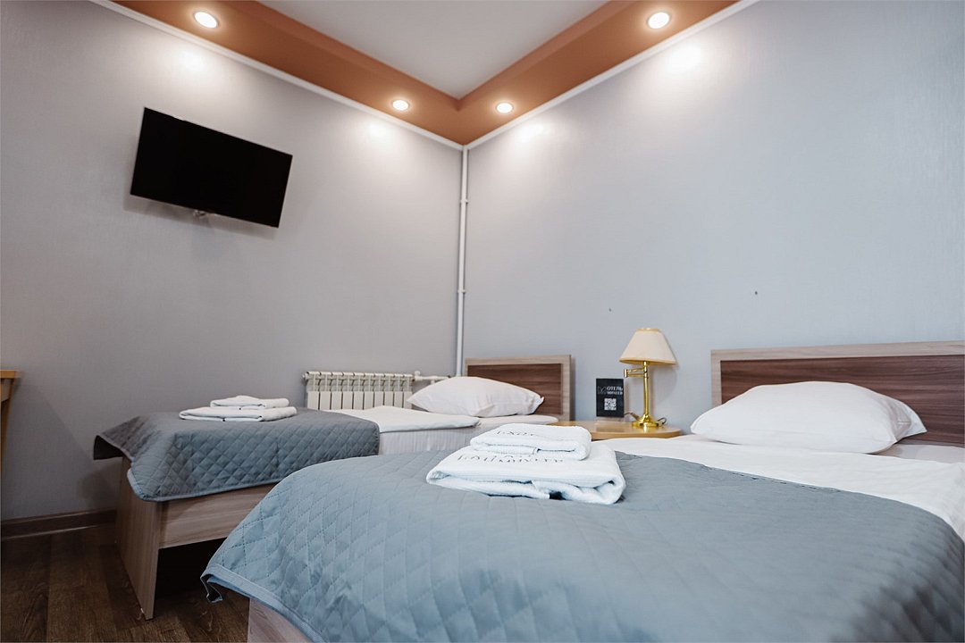 Уютный трёхместный номер со всеми удобствами для проживания с двуспальной кроватью и одной односпальной. В номере есть холодильник, телевизор, электрочайник, бесплатный высокоскоростной wi-fi, постельные и туалетные принадлежности.Услуги и удобства