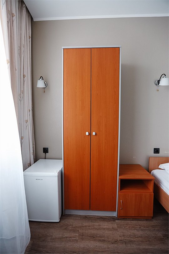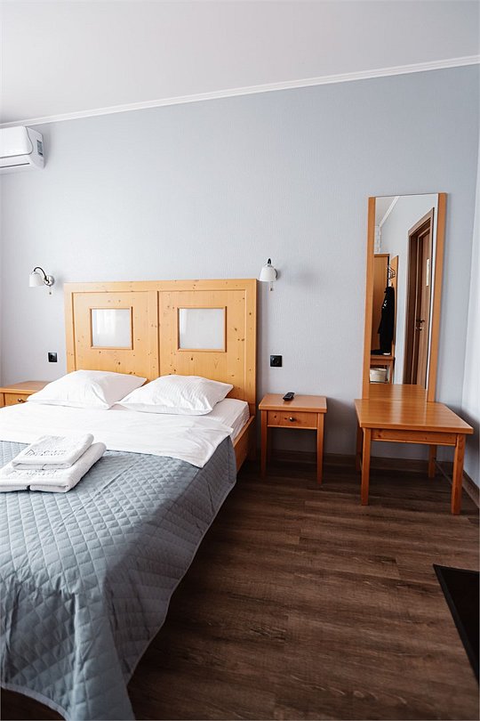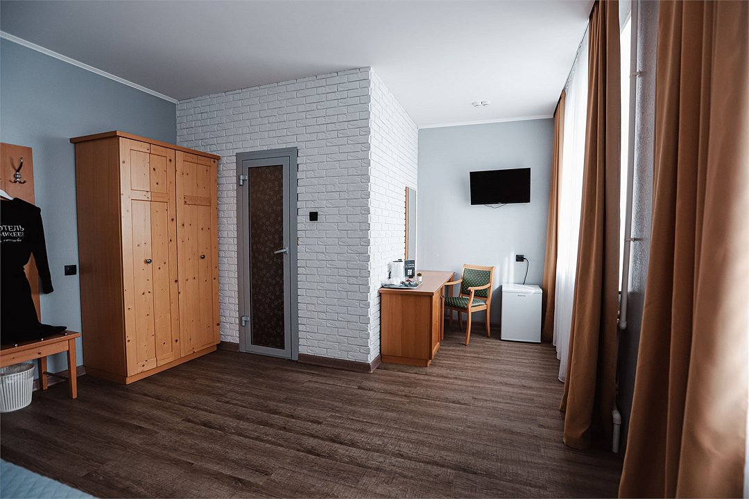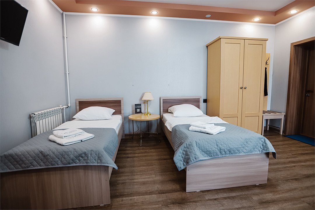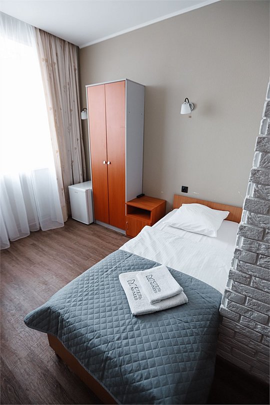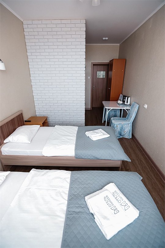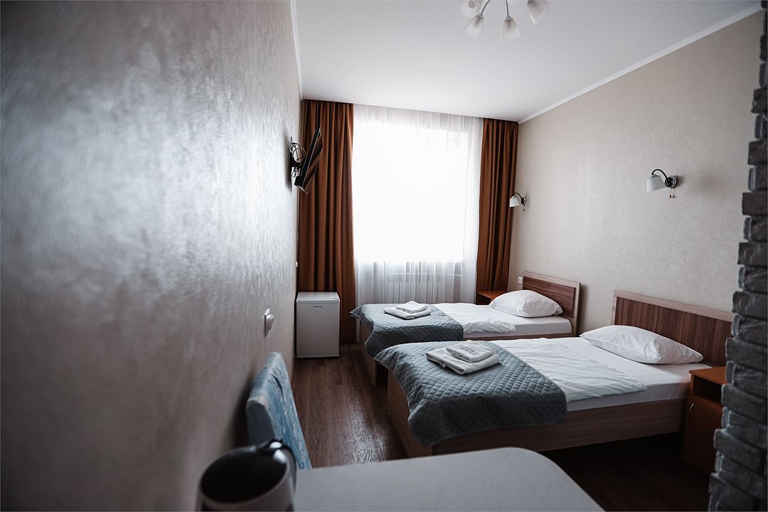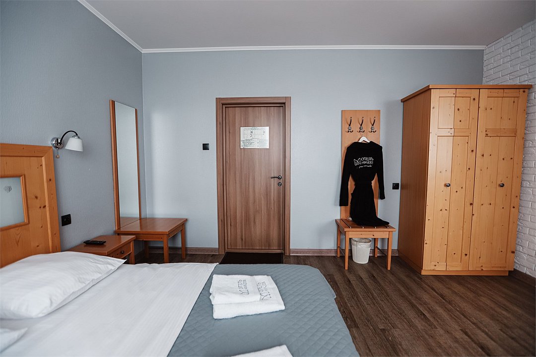 Уютный двухместный номер со всеми удобствами для проживания с двуспальной кроватью. В номере есть холодильник, телевизор, электрочайник, бесплатный высокоскоростной wi-fi, постельные и туалетные принадлежности.Услуги и удобства