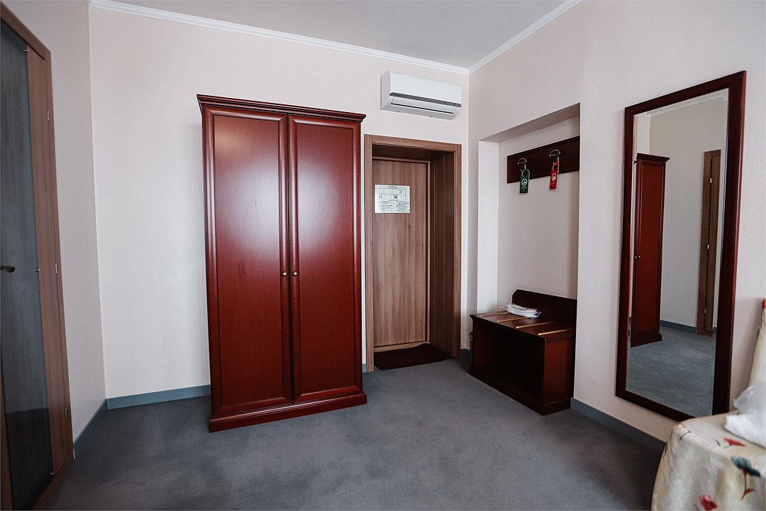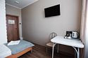 Wi-Fi, ванная комната, двуспальная кровать, односпальная кровать, шкаф для одежды, зеркало, чайный набор, чайник, унитаз, раковина, душ, кулер на этаже, стаканы, стул, тумба, телевизор с плоским экраном, мини-холодильник, номер для некурящих, рабочий столВ номере