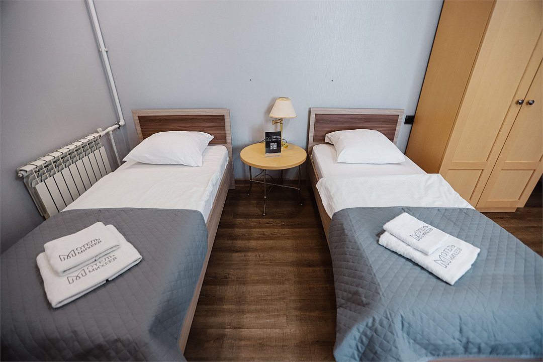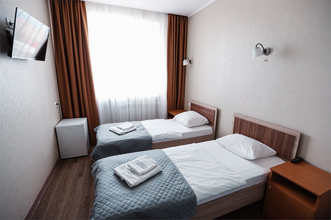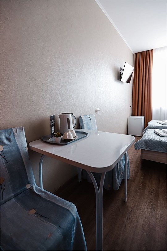 Wi-Fi, ванная комната, две односпальные кровати, стулья, зеркало, чайный набор, чайник, унитаз, раковина, душ, вид на город, кулер на этаже, вид во двор, стаканы, стул, телевизор с плоским экраном, мини-холодильник, номер для некурящих, рабочий столВ номере
