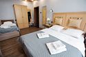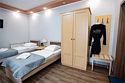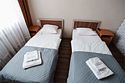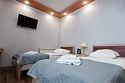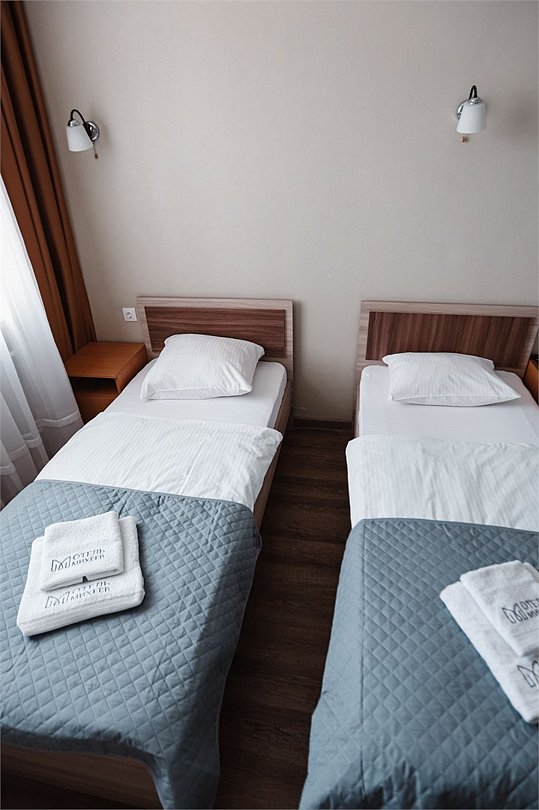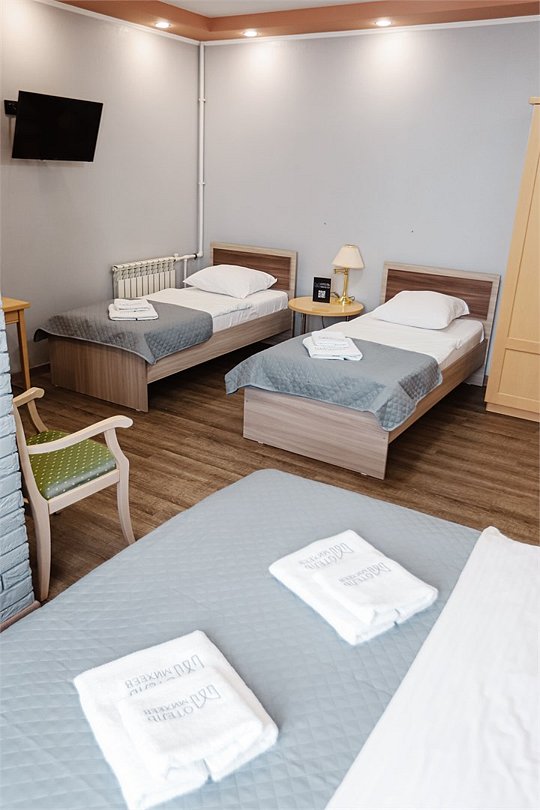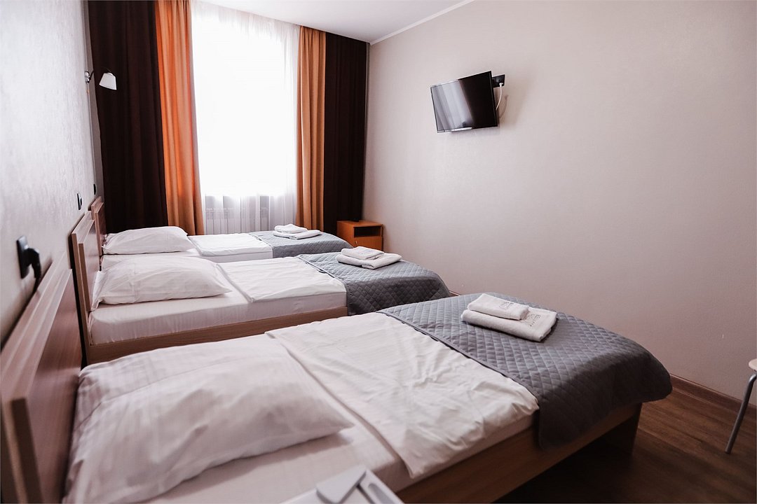 Уютный четырёхместный номер со всеми удобствами для проживания с двуспальной кроватью и двумя односпальными. В номере есть холодильник, телевизор, электрочайник, бесплатный высокоскоростной wi-fi, постельные и туалетные принадлежности.Услуги и удобства