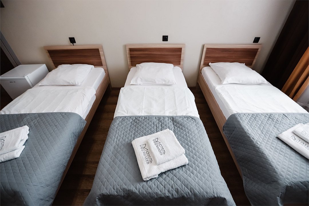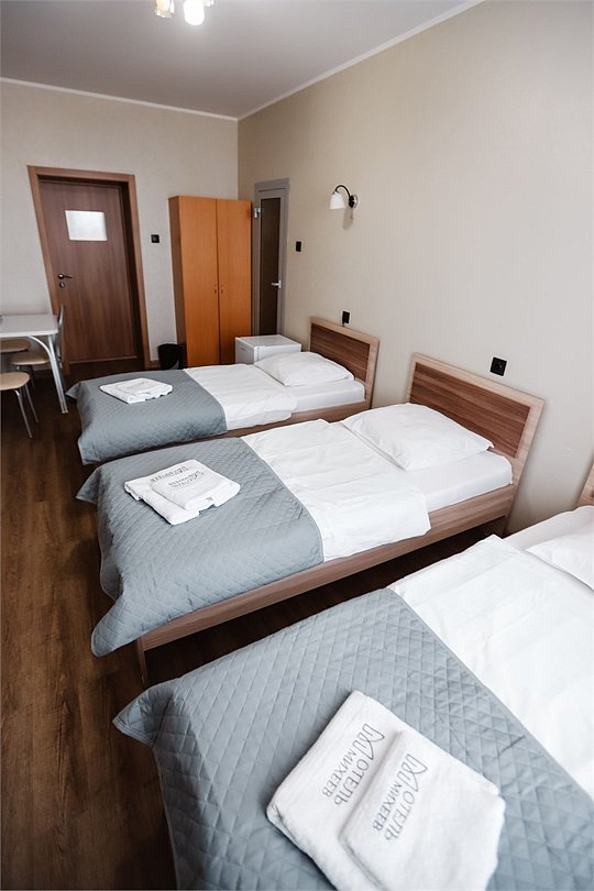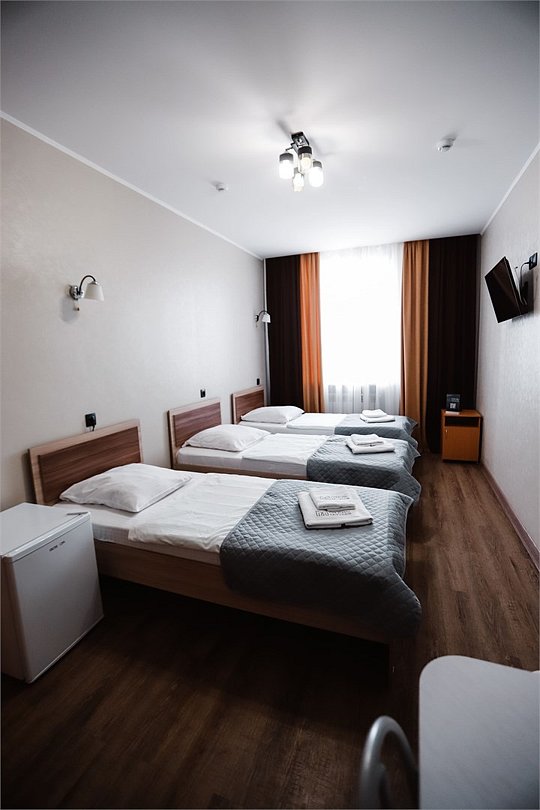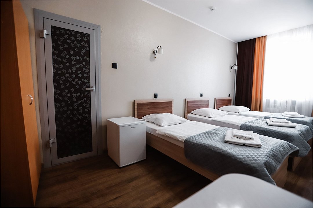 Уютный трёхместный номер со всеми удобствами для проживания. В номере есть холодильник, телевизор, электрочайник, бесплатный высокоскоростной wi-fi, постельные и туалетные принадлежности.Услуги и удобства