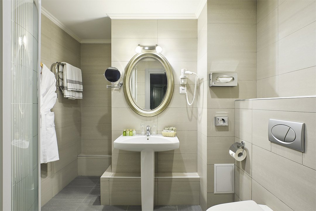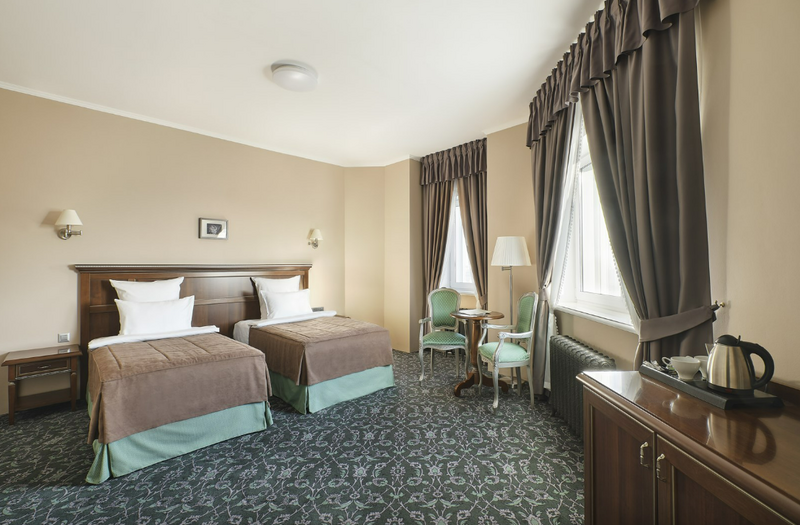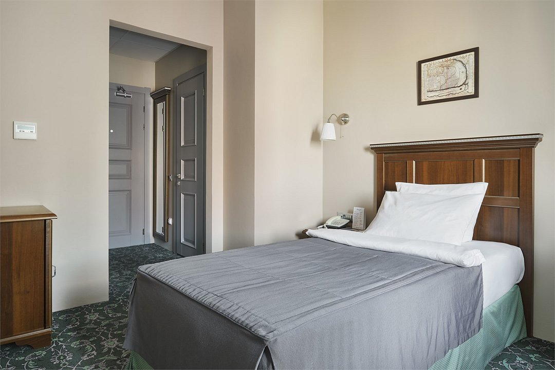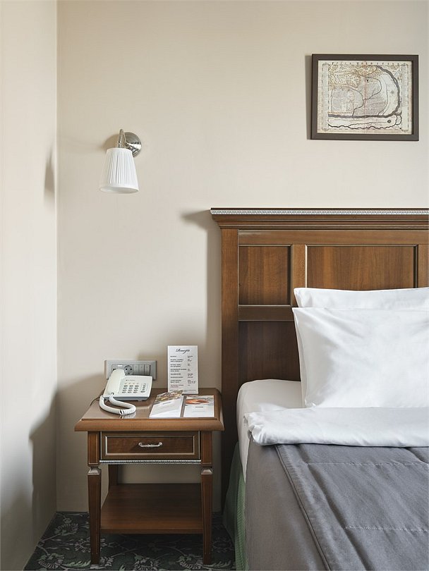 1 комната, климат-контроль, односпальная кровать 100x200 с ортопедическим матрасом, плазменная TV-панель , спутниковое ТВ, интернет W-Fi, телефон, индивидуальный сейф, набор для приготовления чая и кофе, 2 бутылки воды. Мини-бар за дополнительную плату. Ванная комната оснащена стандартной ванной, феном, подогреваемым полом, сушилкой, полотенцами, халат, тапочки, набором ванных и косметических принадлежностей, бритвенный набор-по запросу. Салфетка для обуви,лопатка для обуви. Швейный набор, ватные палочки, расческа в тумбочке под телефоном. Посещение Wellness-центра (финская сауна, хамам и бассейн) – 500 руб./2 ч. с человека.Услуги и удобства