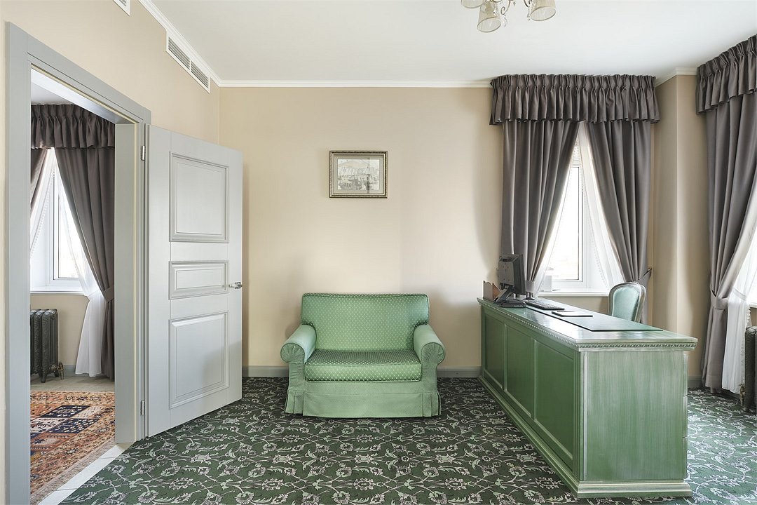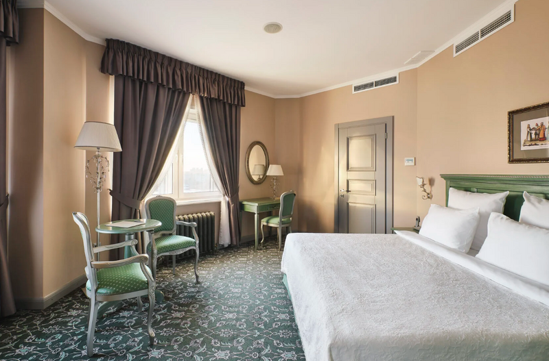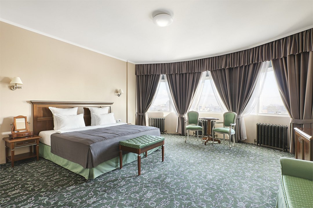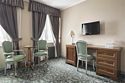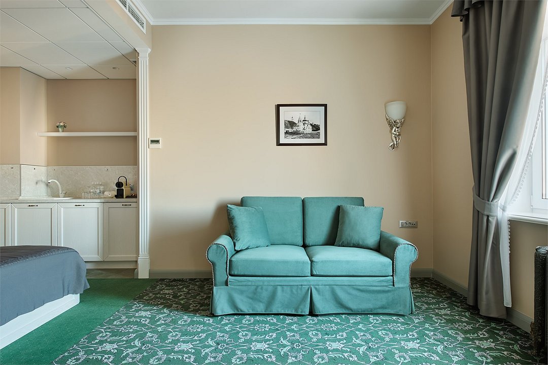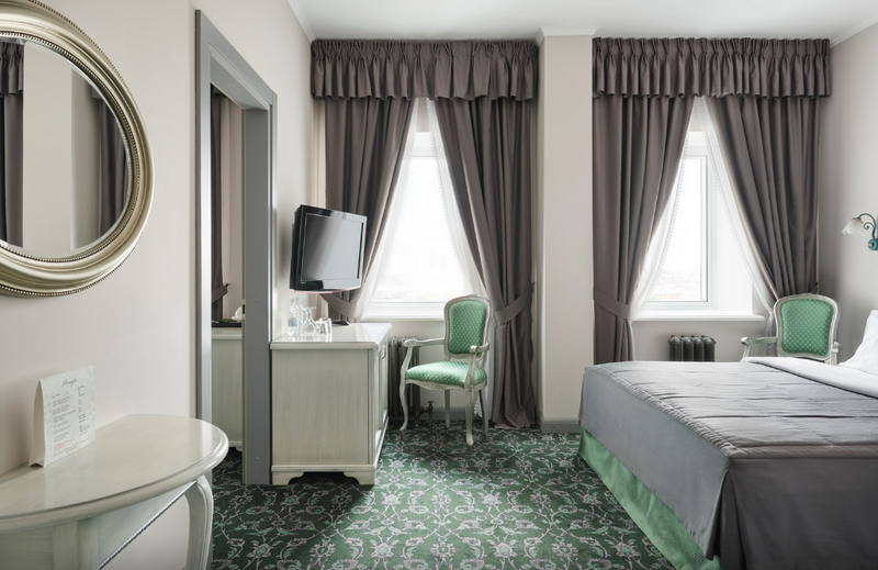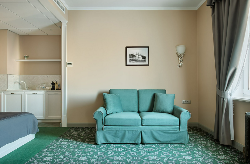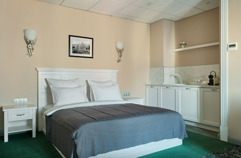 1 комната, кровать king size 180х200 с ортопедическим матрасом, раскладывающийся двухместный диван, прикроватный пуфик, спутниковое ТВ, интернет W-Fi, телефон, индивидуальный сейф, набор для приготовления чая и кофе, 2 бутылки воды по 0,5 л. Ванная комната оснащена стандартной ванной, феном, подогреваемым полом, сушилкой, полотенцами, халат, тапочки, набором ванных и косметических принадлежностей, бритвенный набор-по запросу. Салфетка для обуви,лопатка для обуви. Швейный набор, ватные палочки, расческа в тумбочке под телефоном. Мини-бар за дополнительную плату. Посещение Wellness-центра (финская сауна, хамам и бассейн) – 500 руб./2 ч. с человека.Услуги и удобства