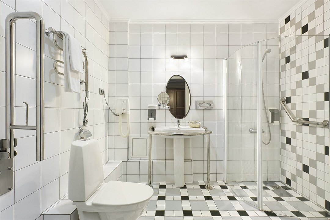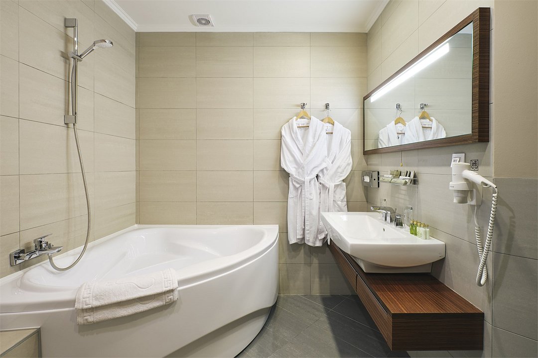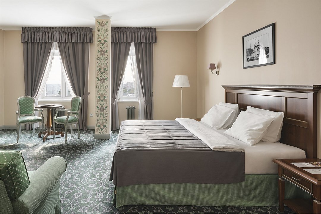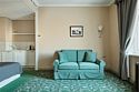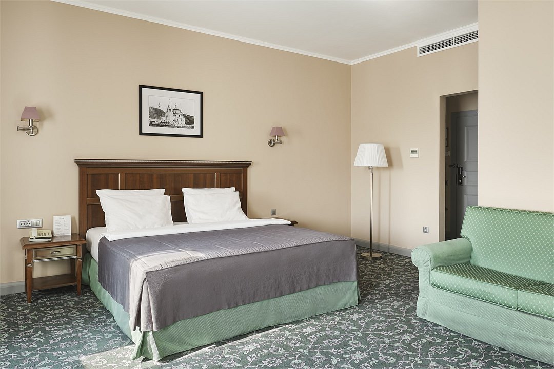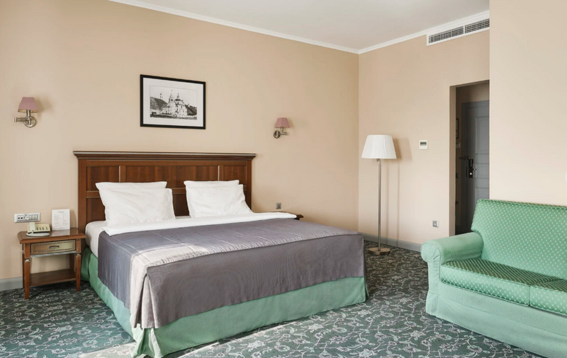 1 комната, кровать king size 180 х 200 с ортопедическим матрасом, раскладывающийся двухместный диван, спутниковое ТВ, интернет W-Fi, телефон, индивидуальный сейф, набор для приготовления чая и кофе, бутилированная вода (2 бутылки по 0,5) Ванная комната оснащена душевой кабиной без бортика с поручнями, феном, сушилкой, полотенцами, халат, тапочки, набором ванных и косметических принадлежностей, бритвенный набор-по запросу. В ванной комнате установлены поручни возле туалета и душа. Салфетка для обуви, лопатка для обуви. Швейный набор, ватные палочки, расческа в тумбочке под телефоном. Мини-бар за дополнительную плату. Посещение Wellness-центра (финская сауна, хамам и бассейн) – 500 руб. / 2 часа с человека.Услуги и удобства