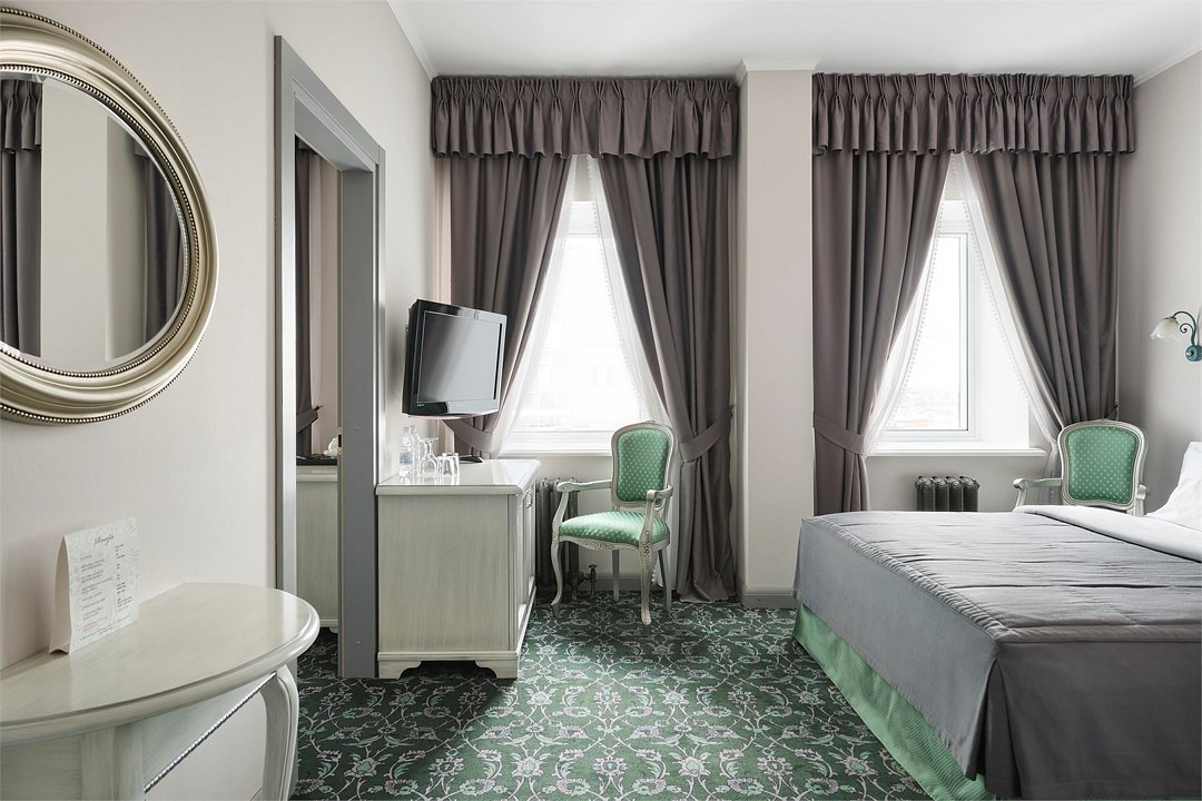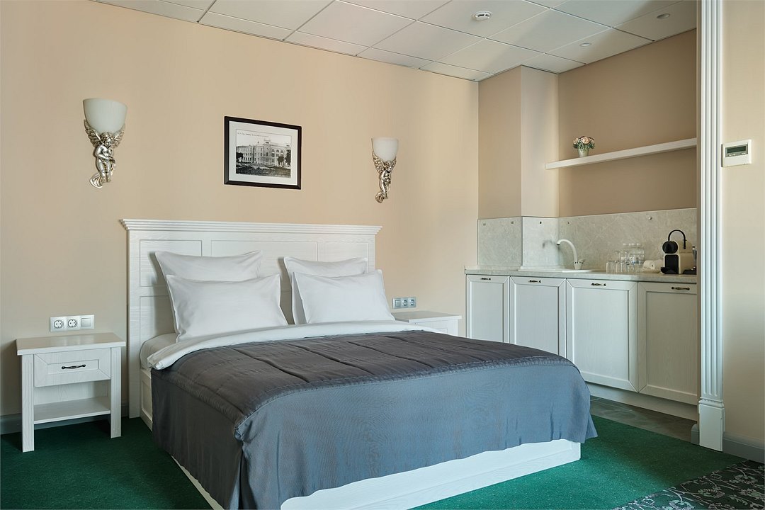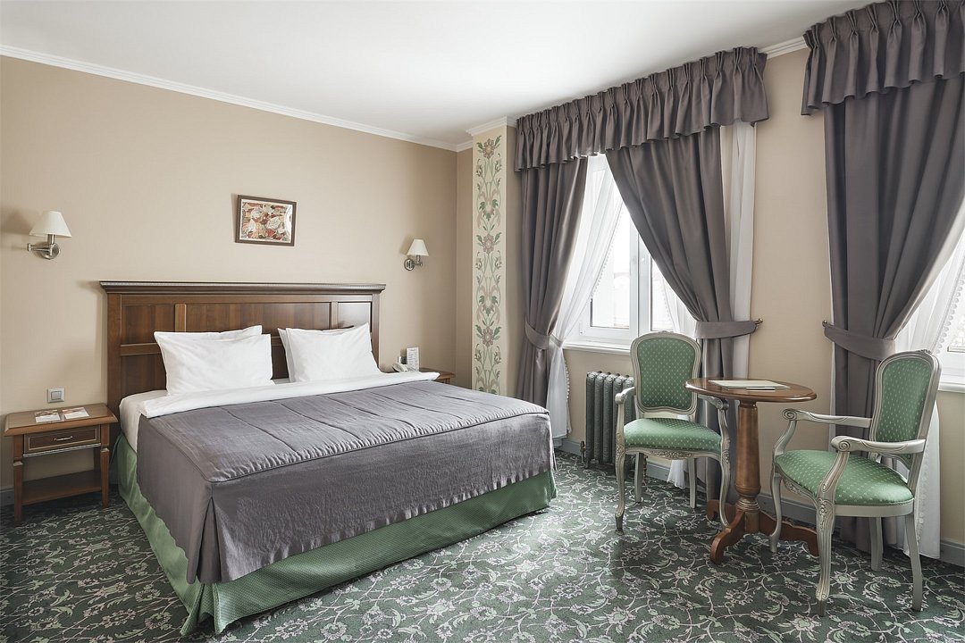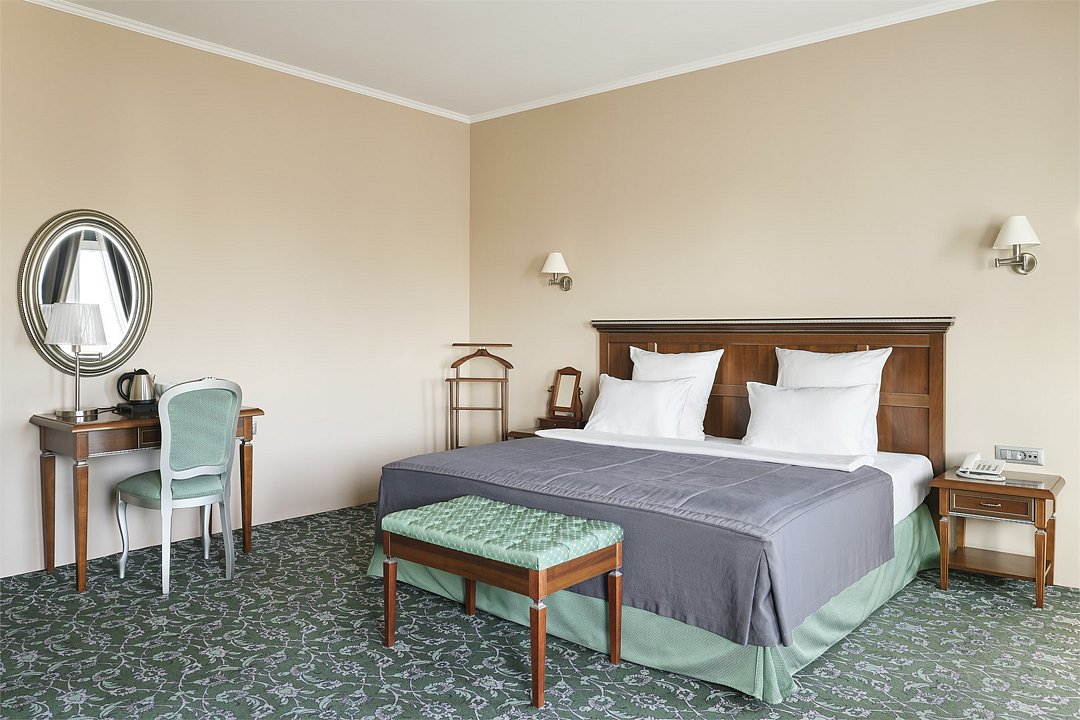 1 комната, кровать queen size 180x200 с ортопедическим матрасом, плазменная TV-панель, спутниковое телевидение, интернет W-Fi, телефон, индивидуальный сейф, набор для приготовления чая и кофе, бутилированная вода(2 бутылки по 0,5),мини-бар за дополнительную плату. Ванная комната оснащена стандартной ванной, феном, подогреваемым полом, сушилкой, полотенцами, халат, тапочки, набором ванных и косметических принадлежностей, бритвенный набор-по запросу. Салфетка для обуви, лопатка для обуви. Швейный набор, ватные палочки, расческа в тумбочке под телефоном. Посещение Wellness-центра (финская сауна, хамам и бассейн) – 500 руб./2 ч. с человека.Услуги и удобства