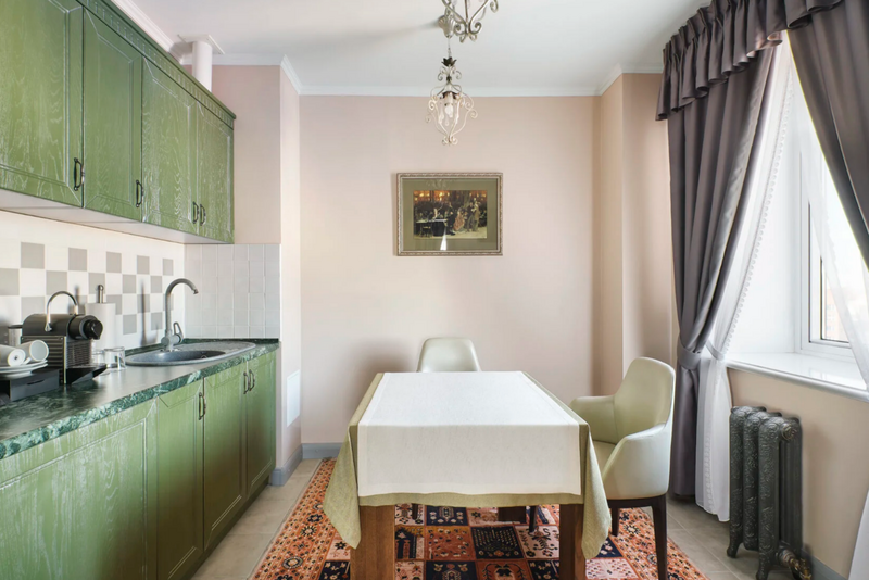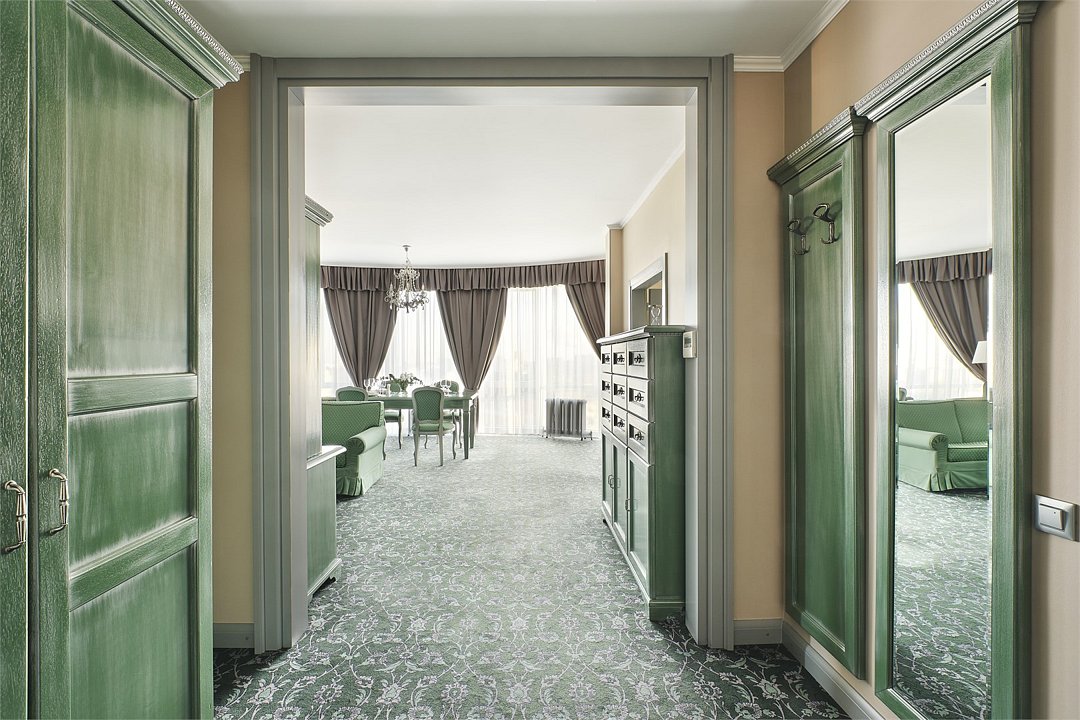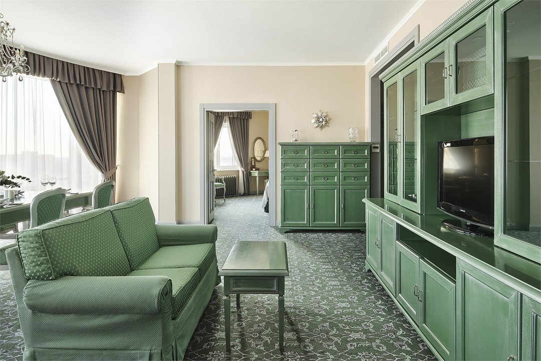 2 комнаты, 2 плазменные TV-панели, спутниковое телевидение, интернет W-Fi, в 1-й комнате кровать queen size 180x200 с ортопедическим матрасом, телефон, индивидуальный сейф, набор для приготовления чая и кофе, кофемашина, бутилированная вода. Во 2-й комнате кровать queen size 180x200, диван 140*200, мини-кухня, кофе машина, чайная станция, набор для приготовления чая и кофе, бутилированная вода. Мини-бар за дополнительную плату. Ванная комната оснащена большой ванной, феном, подогреваемым полом, сушилкой, полотенцами, халат, тапочки, набором ванных и косметических принадлежностей, бритвенный набор-по запросу. Салфетка для обуви, лопатка для обуви. Швейный набор, ватные палочки, расческа в тумбочке под телефоном. Посещение Wellness-центра (финская сауна, хамам и бассейн) - 500 руб./2 ч. с человека.Услуги и удобства