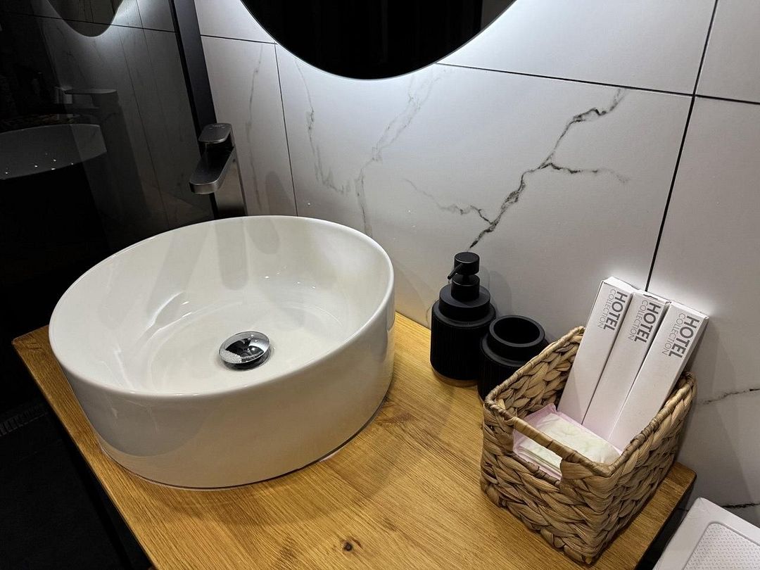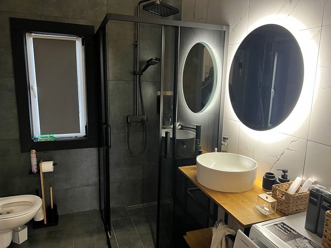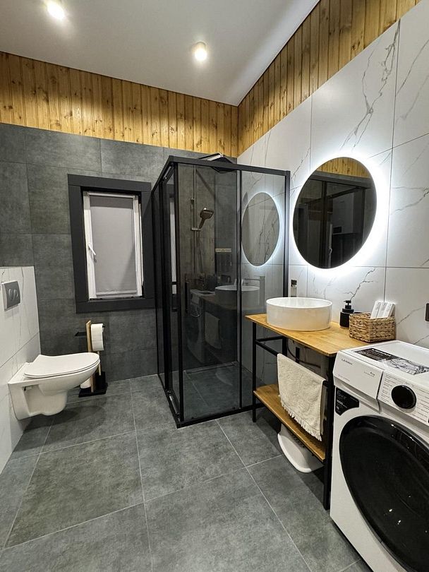 Современная кухня отвечает всем стандартам и оборудована духовым шкафом, микроволновой печью, плитой и посудомоечной машиной. Здесь вы найдете все необходимое — от посуды до приборов, чтобы подготовить вкусные блюда для своих близких. В санузле есть полный набор гигиенических средств, фен, а также зубные щетки и пасты. Шампунь, гель для душа и кондиционер всегда под рукой, чтобы ваша забота о гигиене была на высоте. Кроме того, имеется стиральная машинка с порошком и кондиционером для белья, а также запасы чая, кофе, сахара и соли, чтобы создать атмосферу домашнего тепла.