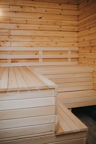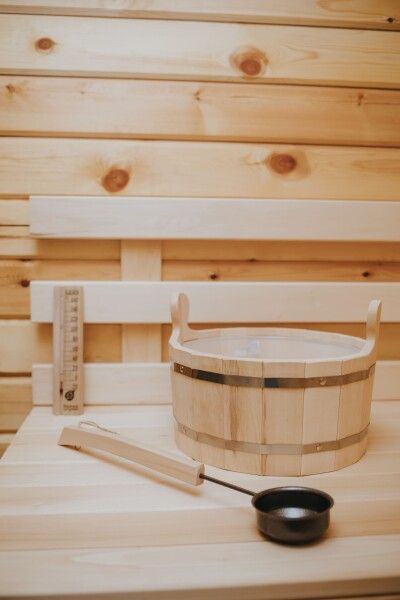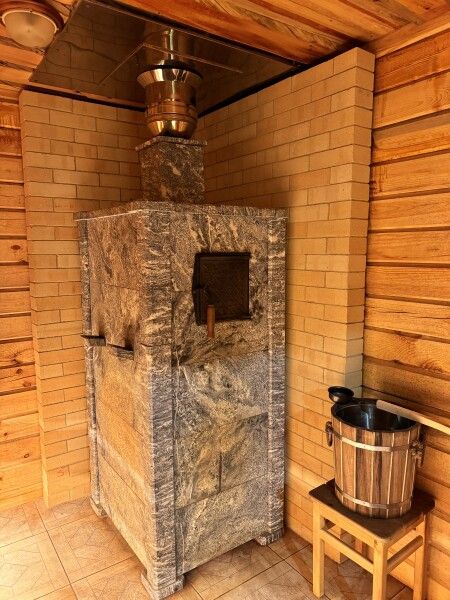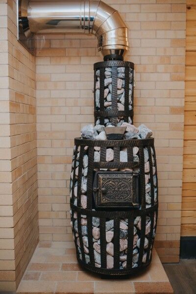 В парной расположена печка, которая использовалась в русских банях, позволяющая комфортно распределять пар.