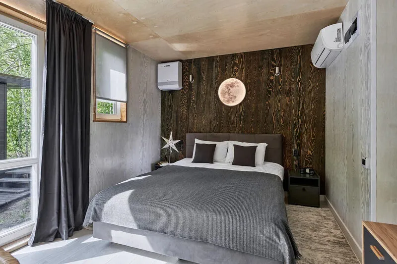 Уютный дом Брауни с панорамными окнами и дизайнерским интерьером в светлых тонах. Полное оснащение домика, комфортное для 4-х человек, своя терраса и много леса кругом.