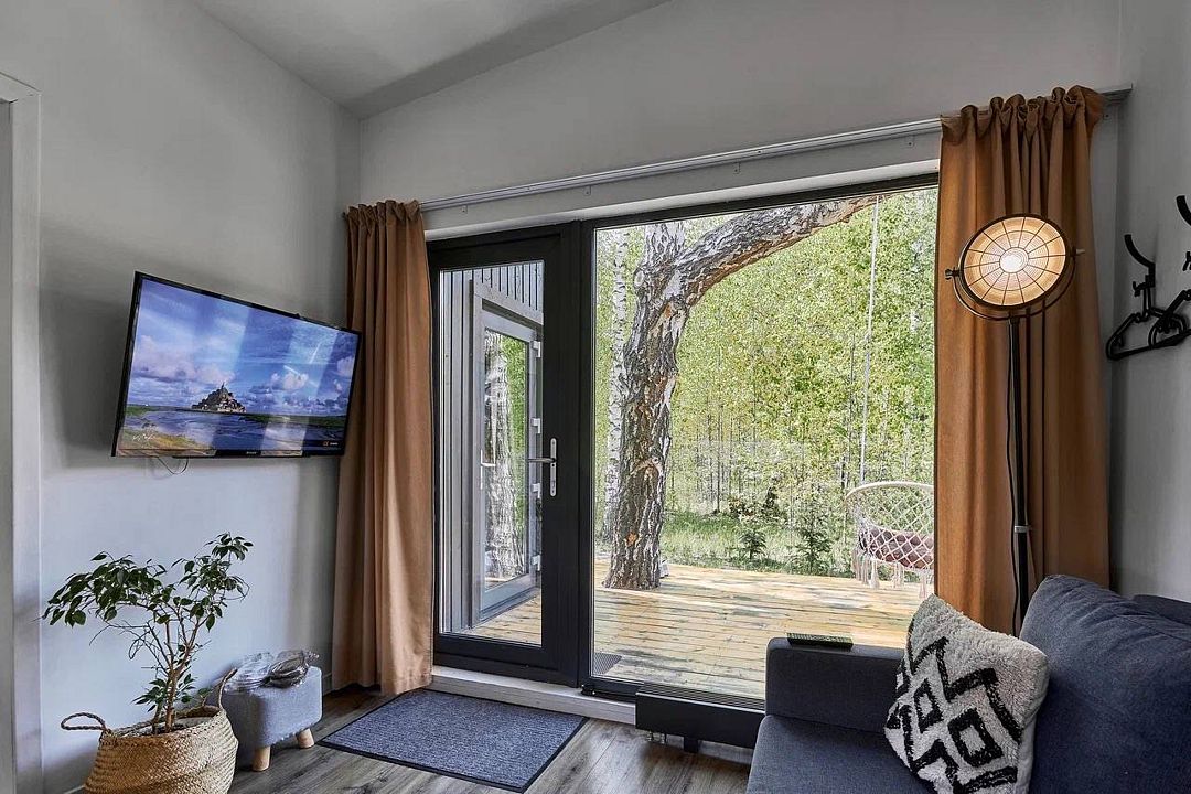 - панорамные окна с видом на берёзовый лес;