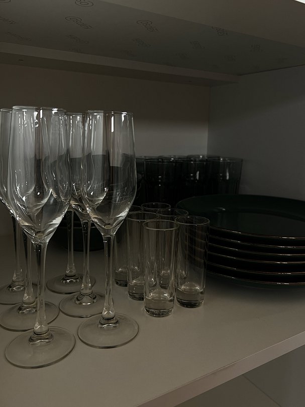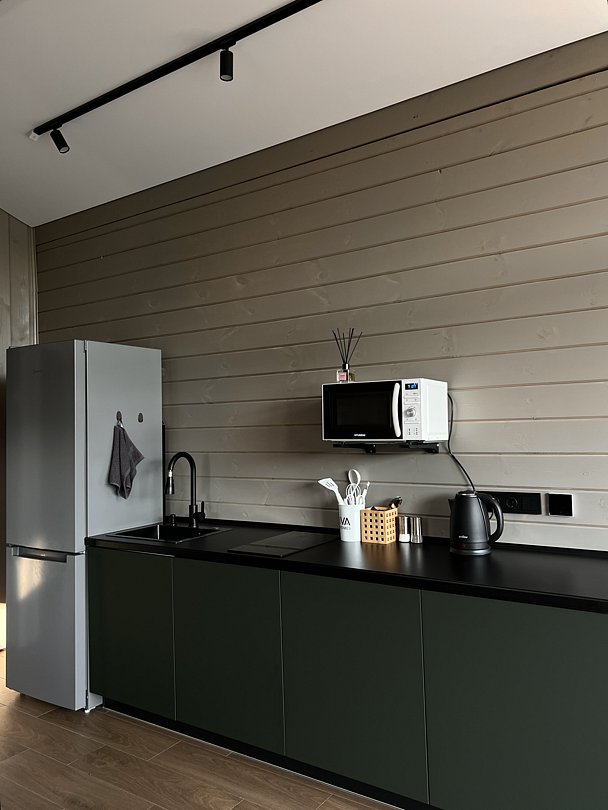 Холодильник, ТВ, микроволновая печь, плита, чайник, весь кухонный инвентарь, Wi-Fi, фен. Электрические теплые полы в доме. Настольные игры. Вся необходимая посуда: бокалы под шампанское/вино, кружки, тарелки, кастрюля, сковородка. Чай, кофе, сахар, соль, перец.