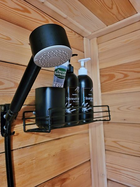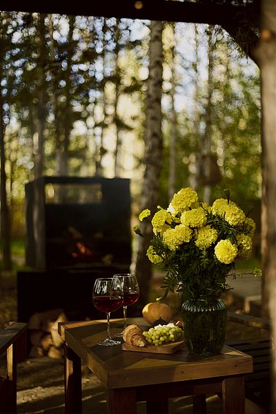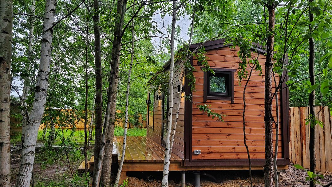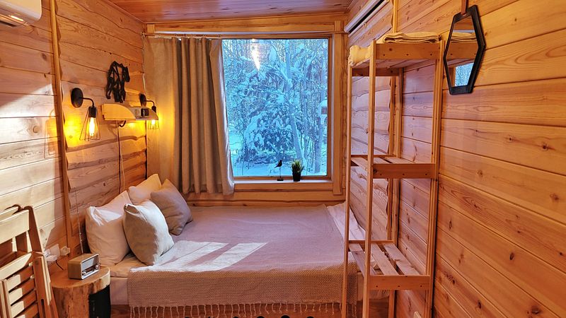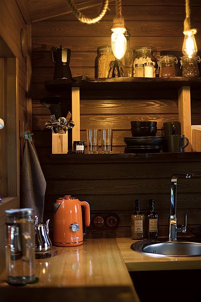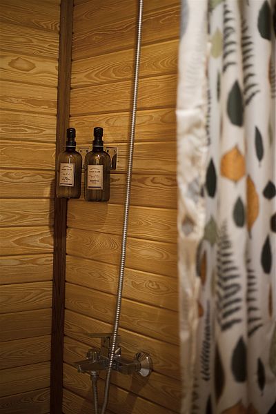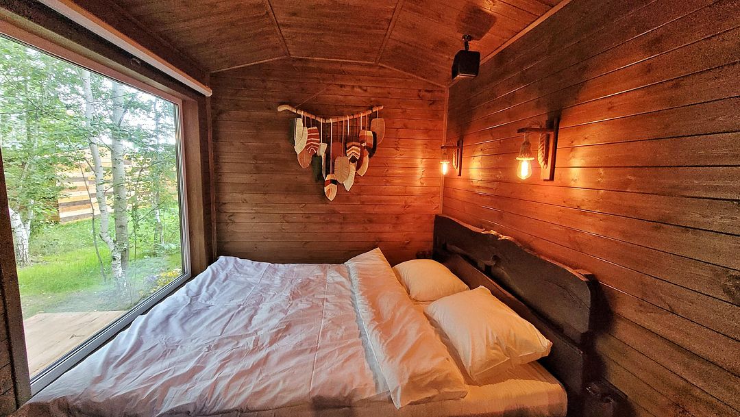 На территории глэмпинга расположен уютный домик, где можно удобно разместиться. Домик предназначен для проживания двух взрослых и одного ребенка при необходимости. Он оборудован кухней, спальней, ванной комнатой и прекрасной террасой для вечерних посиделок. Также доступна банька на дровах с панорамным видом из парной, барбекю-зона с мангалом и открытым пространством для отдыха у костра. Гостям предоставляются решетка для гриля, шампуры и дрова, которые всегда есть в наличии.