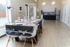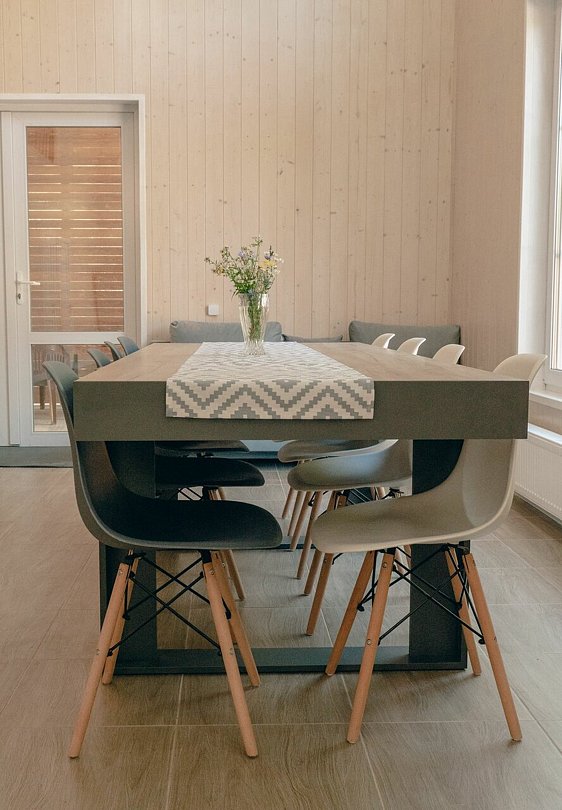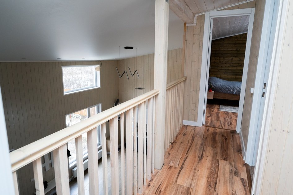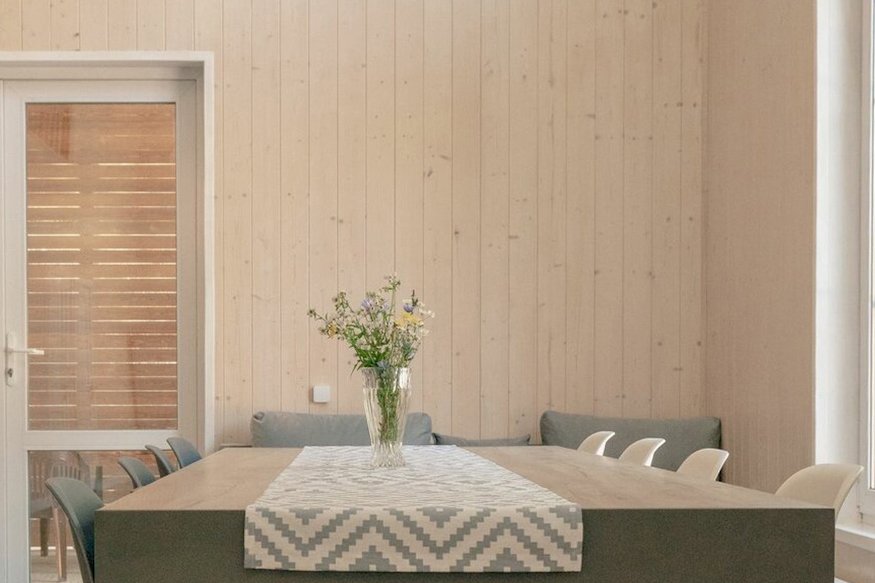 Дом подходит для комфортного отдыха восьми человек (максимально с дополнительным местом десяти человек). В доме два санузла, три изолированные спальни и просторная кухня-гостиная. Кухня оборудована: холодильник, варочная поверхность, СВЧ печь, чайник, посудомоечная машина, посуда, кулер с питьевой водой.