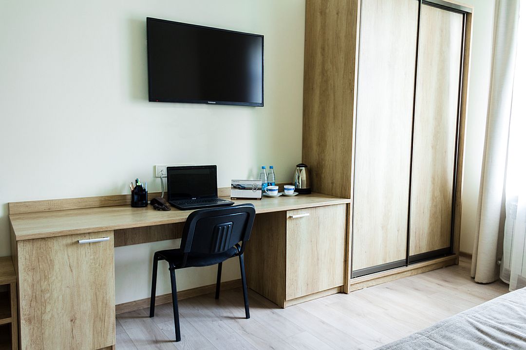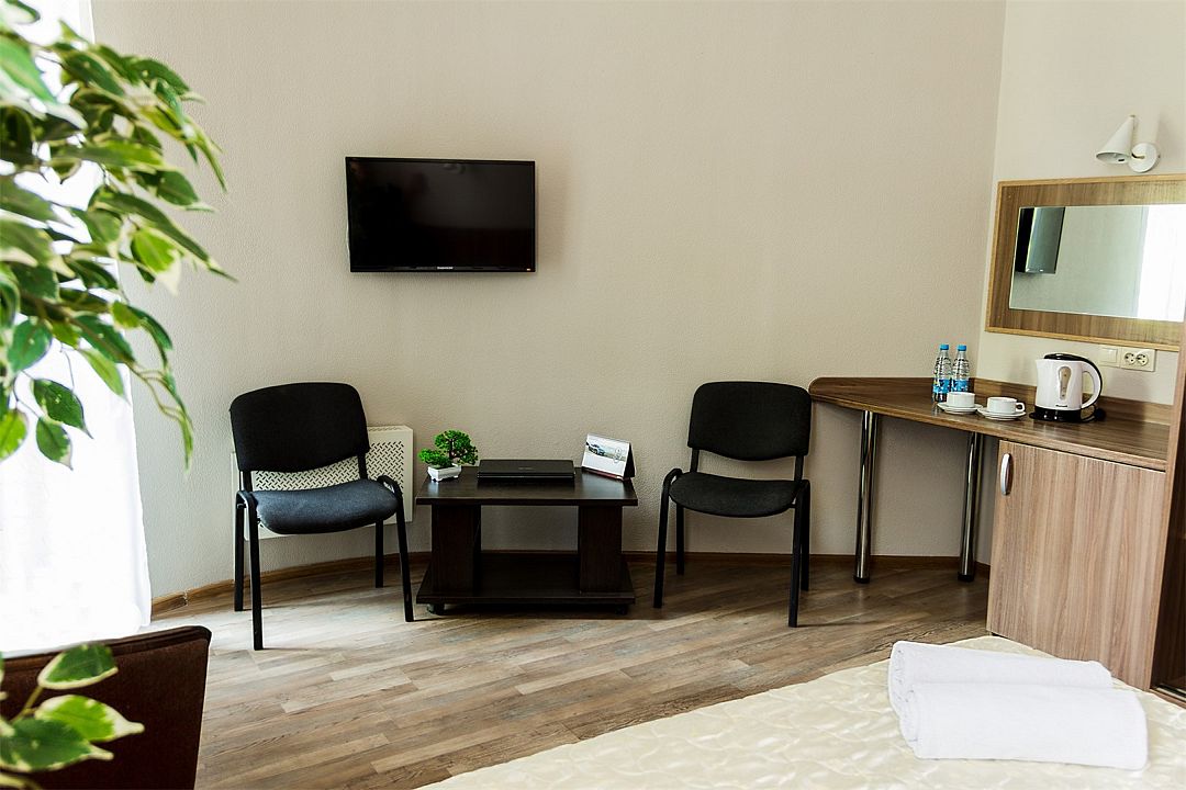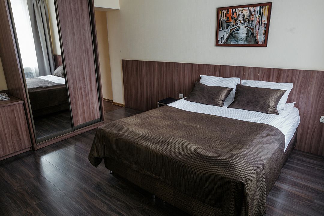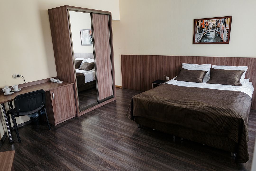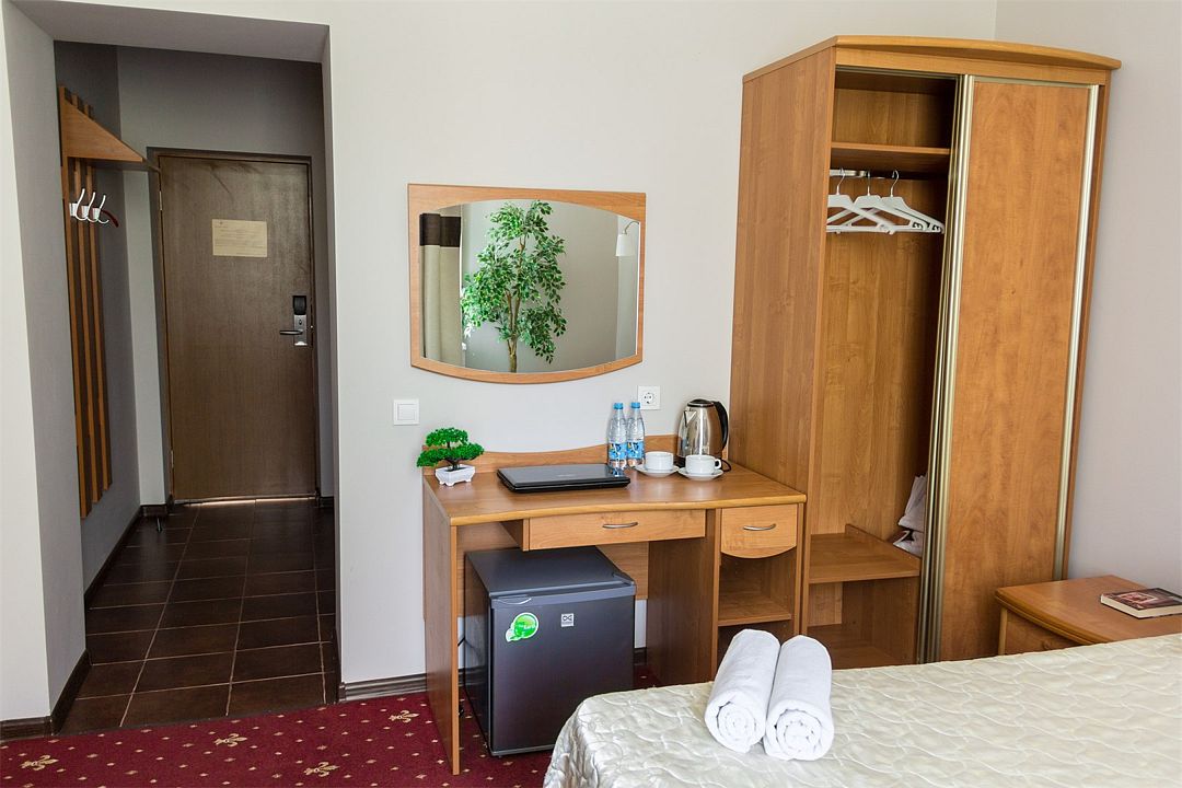 Номер оснащен двухместной кроватью 200*90см с ортопедическими матрасами и гипоаллергенным белым постельным бельем из чистого хлопка, кресло, цифровое ТВ, холодильником, кондиционером, сейфом, wi-fi, телефоном для внутренней связи, гардеробом, просторным рабочим столом, средством для читки обуви, набором для приготовления чая/кофе, одноразовыми тапочками. Душевая комната в современном стиле, оснащена душевой кабиной, косметическим подвесным зеркалом, банными полотенцами, туалетными принадлежностями, средствами личной гигиены.