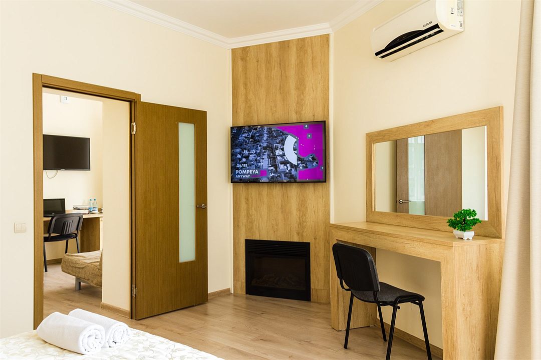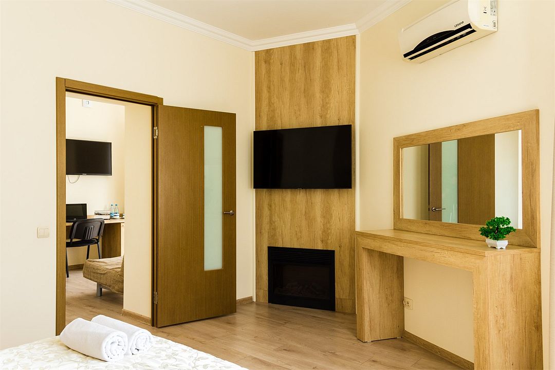 Номер оснащен в одной комнате большой двуспальной кроватью «King-Size» 200*180 с ортопедическими матрасами и гипоаллергенным белым постельным бельем из чистого хлопка, цифровое ТВ, камин, в другой комнате раскладной дизайнерский диван, холодильником, кондиционером, индивидуальным сейфом, телефоном для внутренней связи, просторным гардеробом, рабочим столом, кожаным диваном, журнальным столиком, набором для приготовления чая/кофе, минеральной водичкой, одноразовыми тапочками. Ванная комната в классическом европейском стиле, оснащена душевой кабиной, косметическим подвесным зеркалом, банными полотенцами, туалетными принадлежностями, средствами личной гигиены.