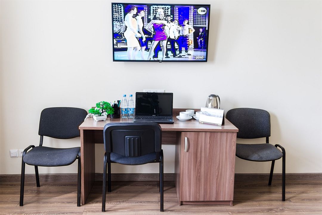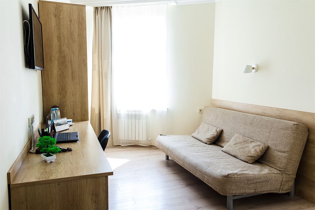Номер оснащен двумя раздельными кроватями 200*90см, Диван угловой раскладывающийся с ортопедическими матрасами и гипоаллергенным белым постельным бельем из чистого хлопка, цифровое ТВ, холодильником, кондиционером, сейфом, wi-fi, телефоном для внутренней связи, гардеробом, просторным рабочим столом, средством для читки обуви, набором для приготовления чая/кофе, одноразовыми тапочками. Душевая комната в современном стиле, оснащена душевой кабиной, косметическим подвесным зеркалом, банными полотенцами, туалетными принадлежностями, средствами личной гигиены.