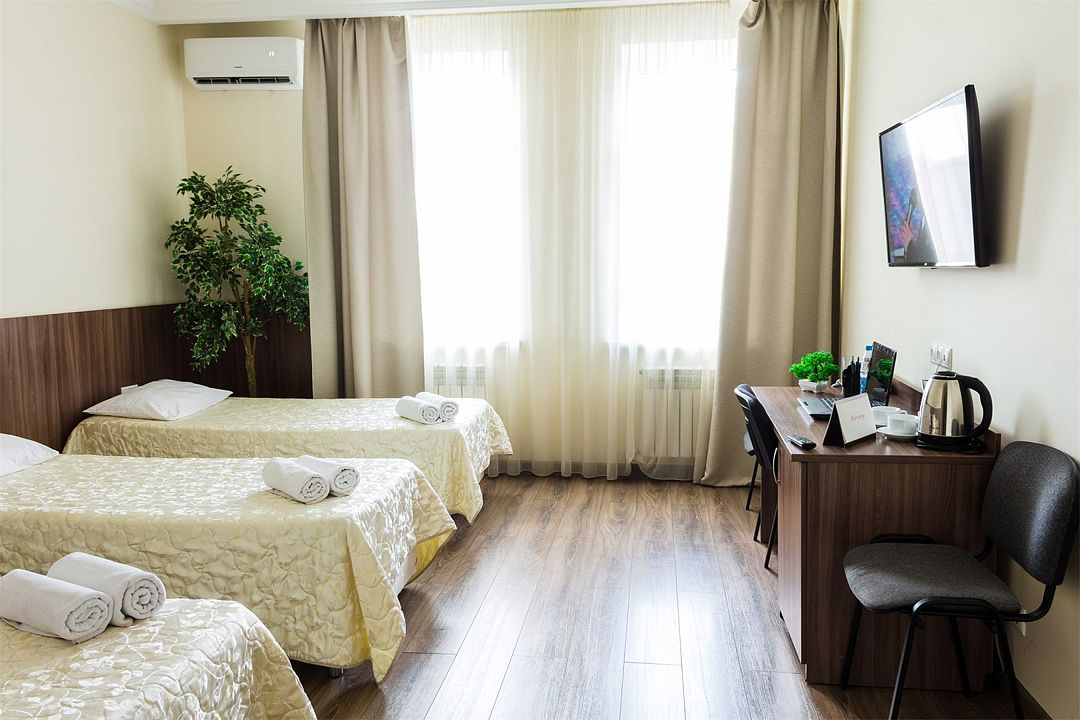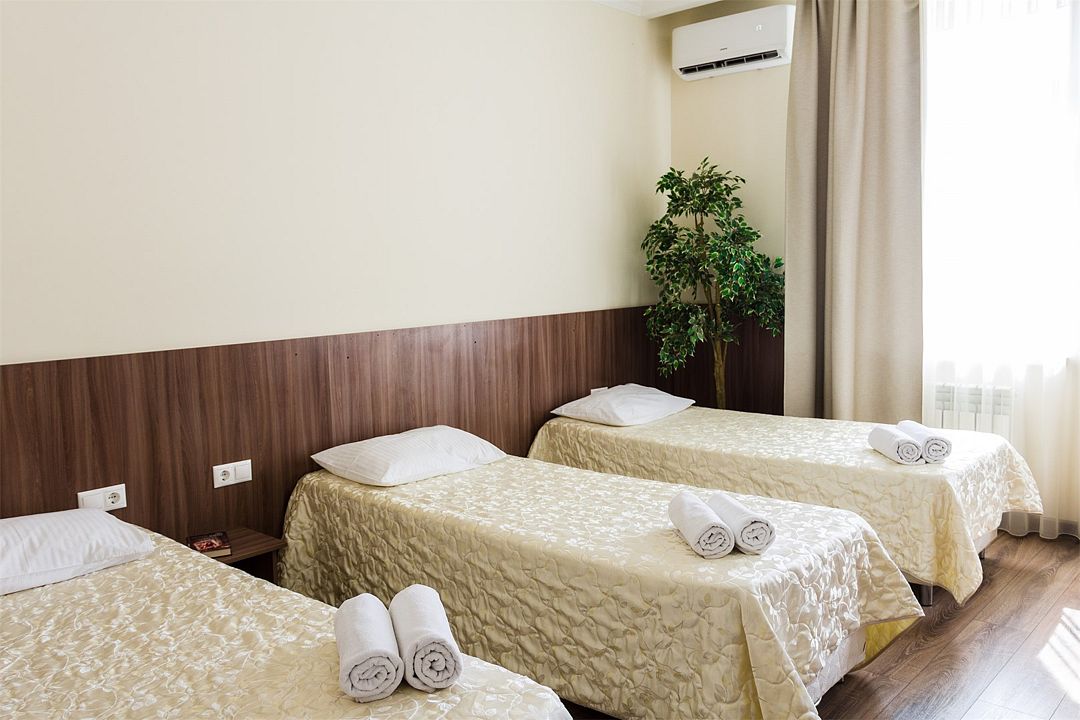 Номер оснащен тремя раздельными кроватями 200*90см с ортопедическими матрасами, либо двухместной кроватью 180*200 см. и одной односпальной кроватью 90*200 и гипоаллергенным белым постельным бельем из чистого хлопка, цифровое ТВ, холодильником, кондиционером, сейфом, wi-fi, телефоном для внутренней связи, гардеробом, просторным рабочим столом, средством для читки обуви, набором для приготовления чая/кофе, одноразовыми тапочками. Душевая комната в современном стиле, оснащена душевой кабиной, косметическим подвесным зеркалом, банными полотенцами, туалетными принадлежностями, средствами личной гигиены.