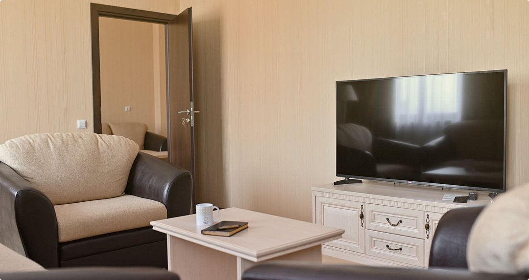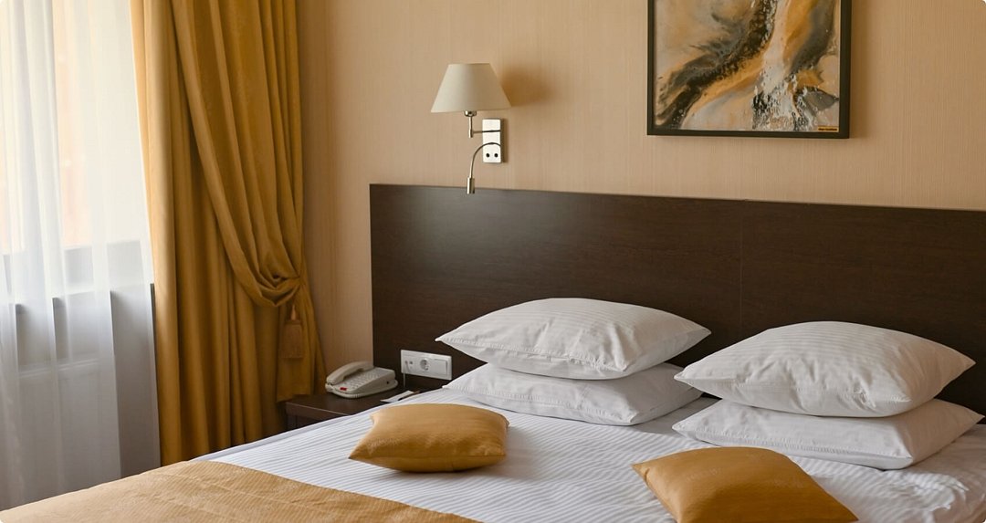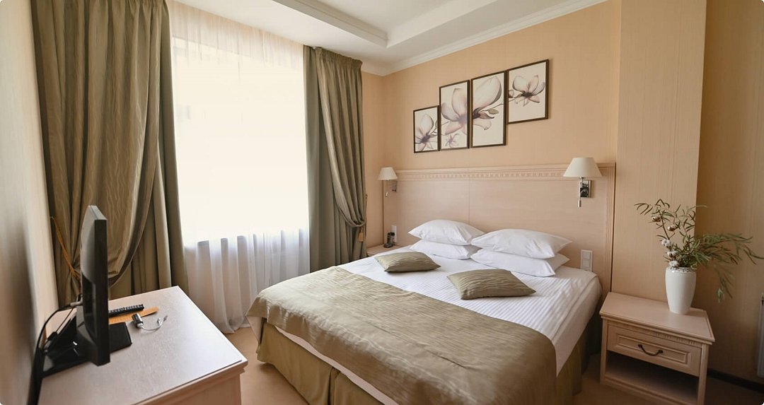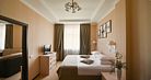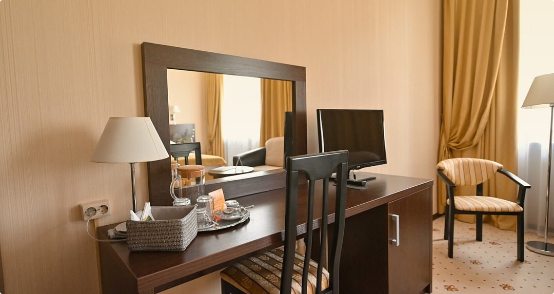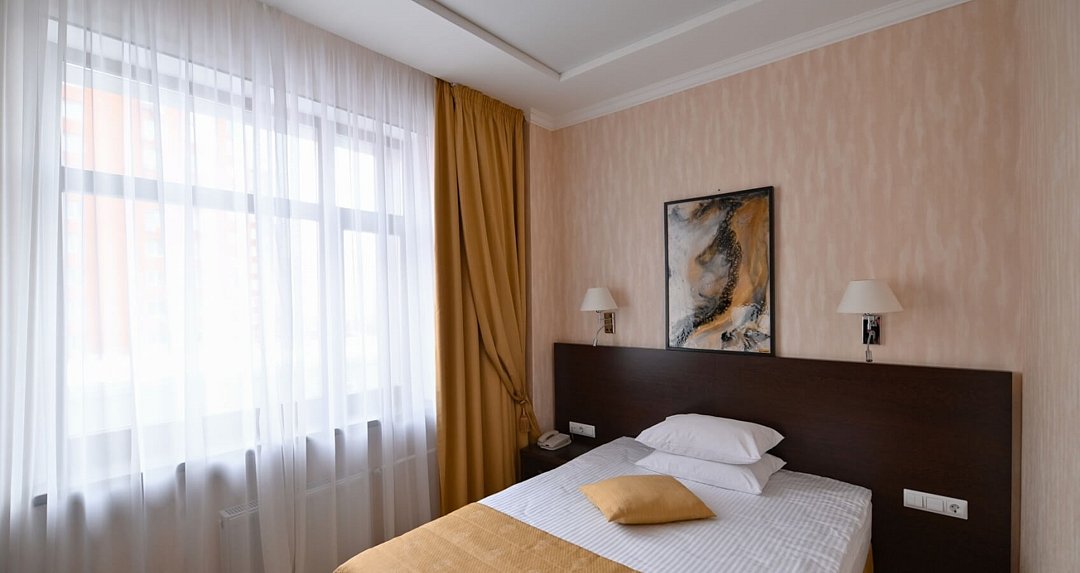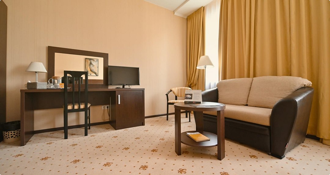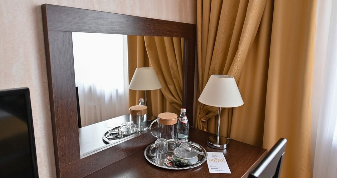 Просторный одноместный номер. Элегантные номера располагают двухспальной кроватью, двумя прикроватными тумбами, письменным столом с тумбой для холодильника, телевизором с плоским экраном, шкафом для одежды, зеркалом, двумя стульями тумбой для чемоданов, журнальным столиком. В каждом номере для гостей нашего отеля предоставляется халат, тапочки, чайный набор. В ванной комнате — душевая кабина, фен, косметический набор. В номерах содержится все необходимое для полноценного отдыха: халат, тапочки, чайный набор, бесплатный сейф и беспроводной интернет, круглосуточный room service.Услуги и удобства