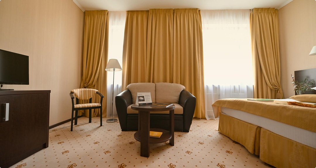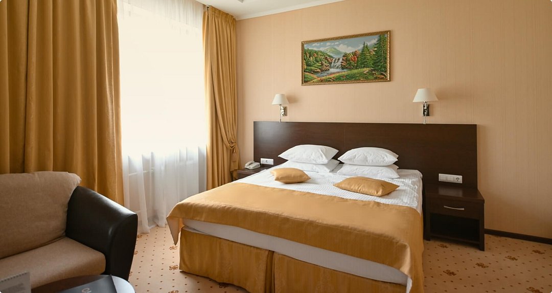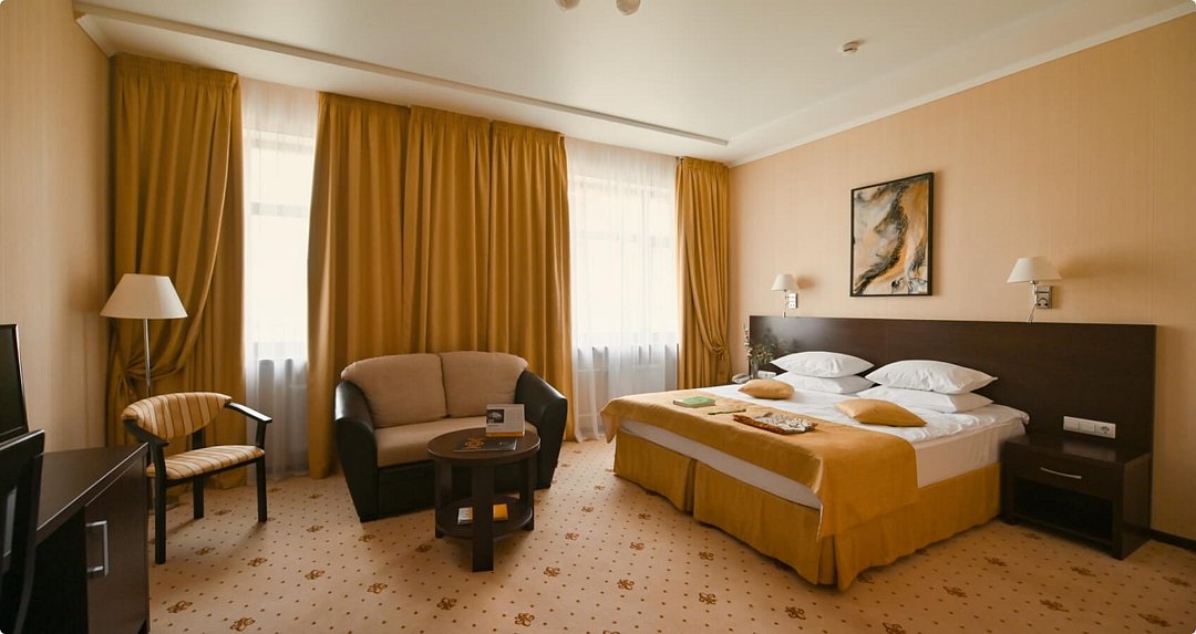 просторный номер площадью 27 м², предназначен для размещения двоих человек. Всего номеров данной категории в гостиничном комплексе 23. Уютные мебилированные номера площадью 27 м² категории бизнес разделены на две части, каждая из которых имеет изысканный интерьер, который представлен: двухспальной кроватью 180×200, раскладным диваном, использовать который можно в качестве дополнительного спального места для ребенка, двумя прикроватными тумбами, так же в номера данной категории есть стол письменный с тумбой для холодильника, шкаф для одежды, шкаф для книг, электронный сейф, зеркало, 2 стула,тумба для чемоданов, журнальный столик, телефон, доступ в Интернет. Интерьер номеров категории Бизнес украшают настенные картины. В ванной комнате: душевая кабина, фен, косметический набор.Услуги и удобства