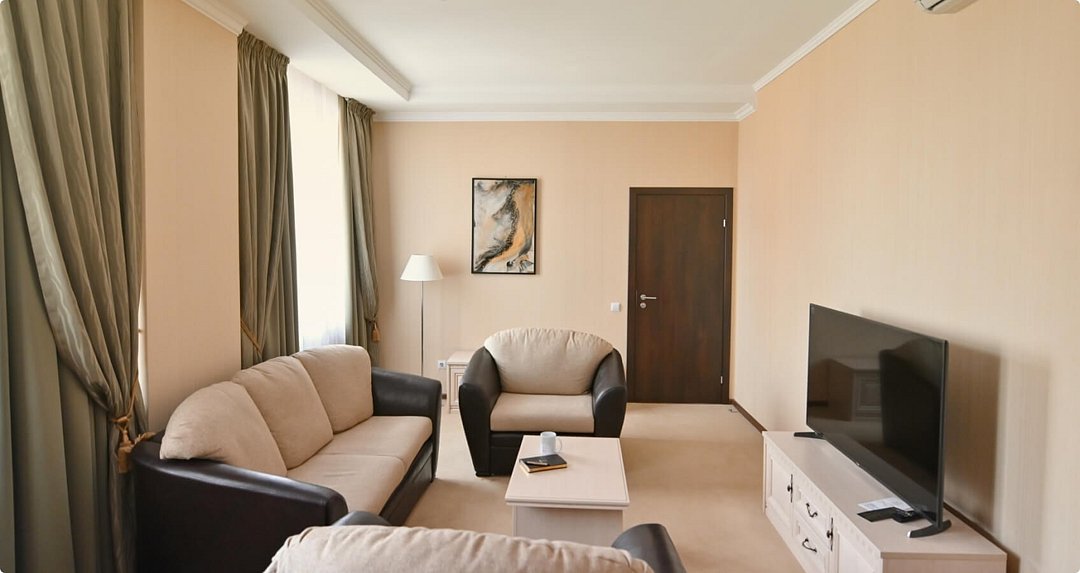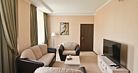 Двухкомнатный номер площадью 48 м2, состоящий из гостиной и спальни, соединенных между собой. Интерьер номера оформлен в светлой гамме.
