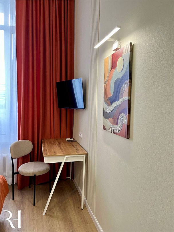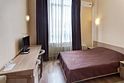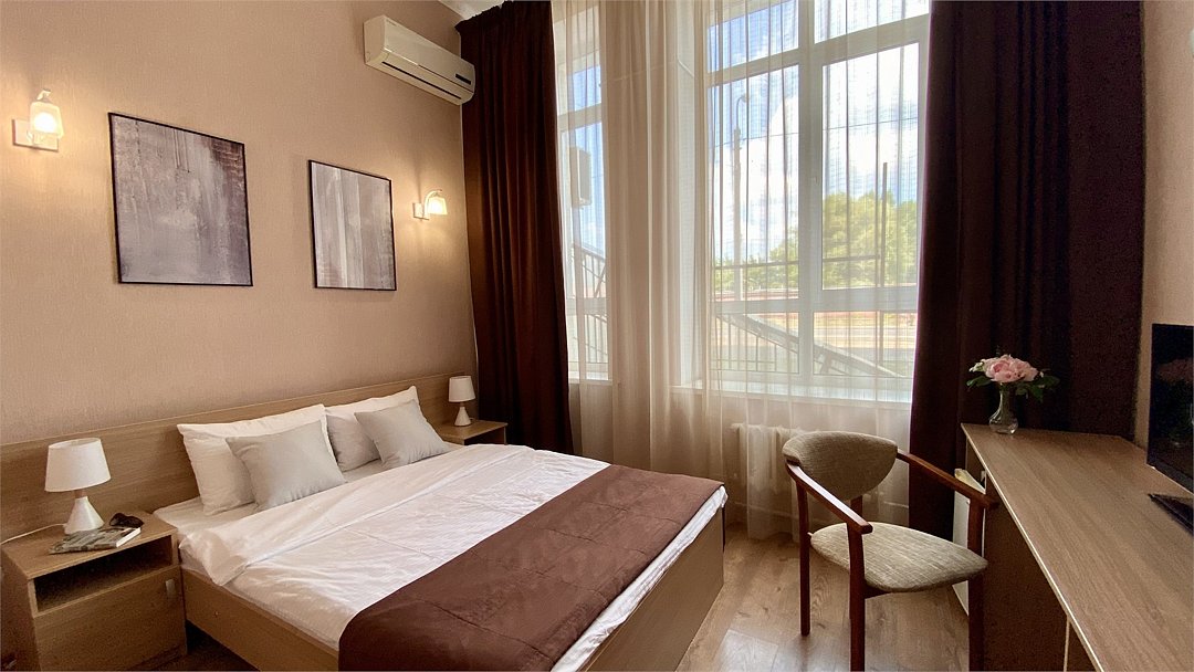 Наш улучшенный двухместный номер площадью 20 кв.м. предлагает гостям элегантный интерьер и комфортную обстановку. Номер оснащен большой двуспальной кроватью с ортопедическим матрасом, журнальным столиком и уютной зоной отдыха с, а также рабочим столом. Ванная комната располагает душевой кабиной, феном и набором туалетных принадлежностей. К услугам гостей бесплатный Wi-Fi, телевизор с плоским экраном, мини-холодильник и кондиционер. Из окна номера открывается прекрасный вид на город.Услуги и удобства