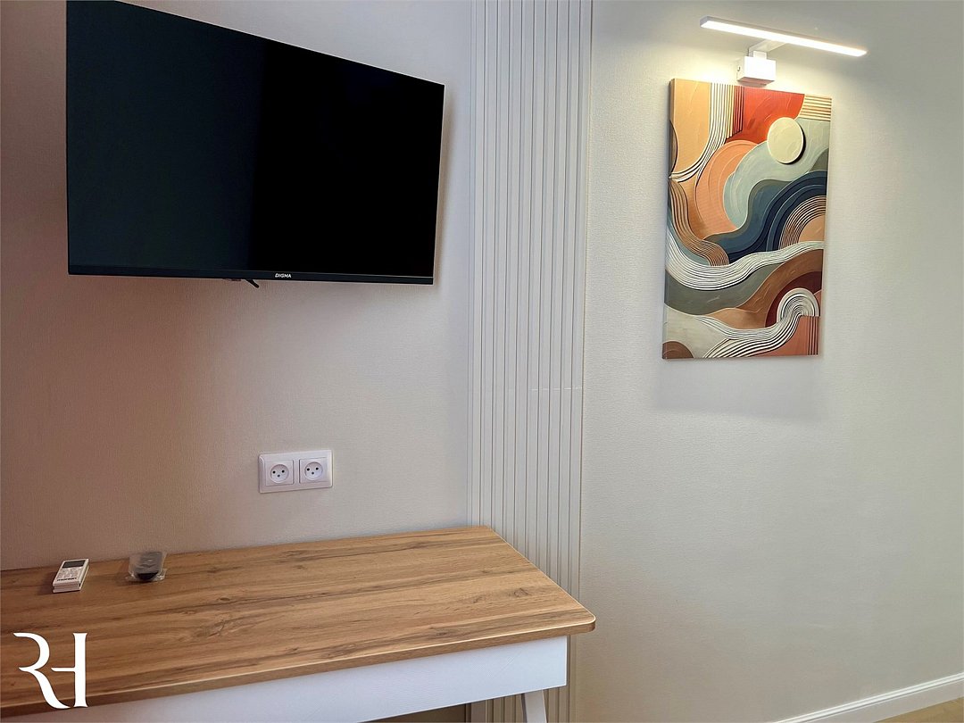 кабельное телевидение, Wi-Fi, интернет, холодильник, кондиционер, фен, микроволновая печь, утюг, душевая кабина, санузел, банные полотенца, гигиенические средства, односпальная кровать, тумбы, стулья, журнальный столик, зеркало, раздельный санузел, стол, туалетные средства, телевизор с плоским экраном, мылоВ номере