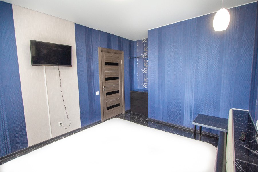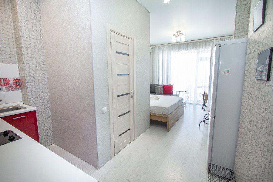 Апартаменты с кухней и кондиционером. Индивидуальная терраса оборудована качелью, столиком и диваном, с прекрасным видом на реку и город. Полноценная кухня, холодильник, посуда, телевизор, WI-FI. Очень удобно, как для деловых поездок, так и для размещения семьи. Просторная комната площадью 25 м2.
