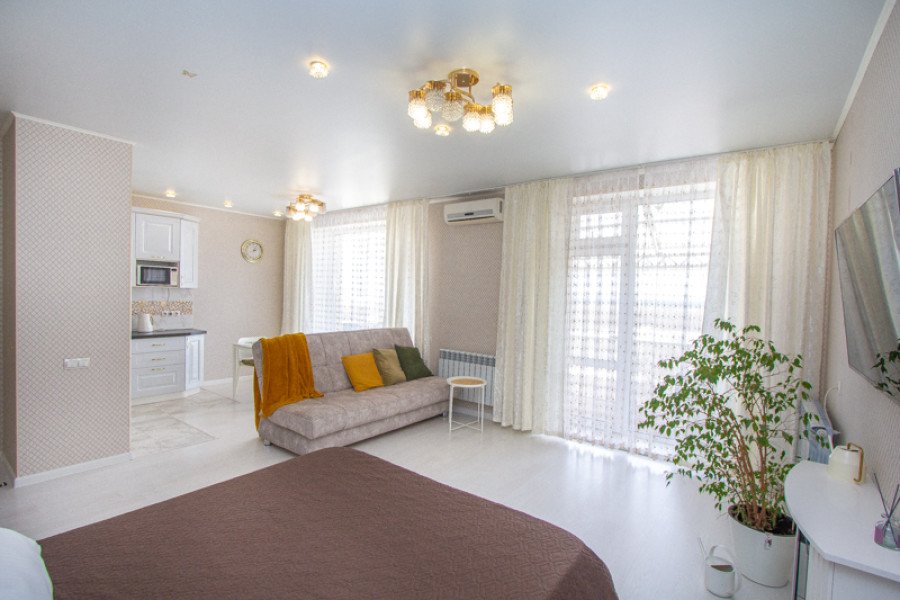Просторная студия одна на этаже, оформленная в эко-стиле. Студия оборудована двуспальной кроватью с подсветкой с ортопедическим матрасом и большим раскладным диваном. Большой СМАРТ телевизор, кухонный уголок с чайником, холодильником, микроволновкой, плитой и посудой. Кондиционер для прохлады в летнею жару. Санузел с ванной, туалетными принадлежностями, комплектом полотенец, феном.