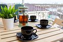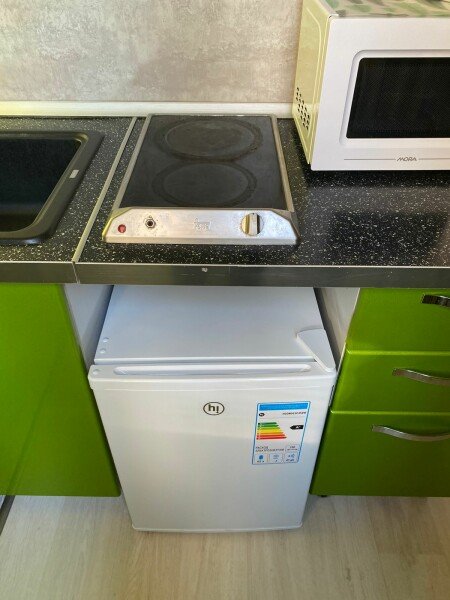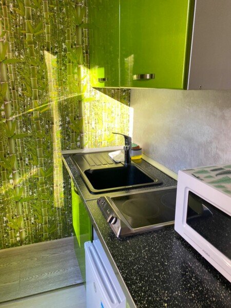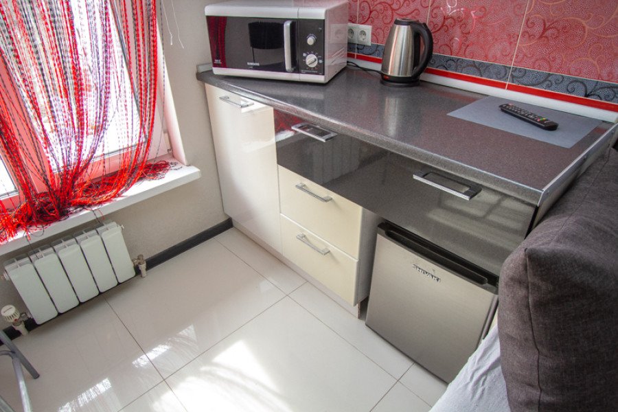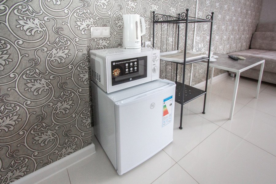 Студия оборудована кондиционером для прохлады в летнею жару. Холодильник, чайник, микроволновка и набор посуды.