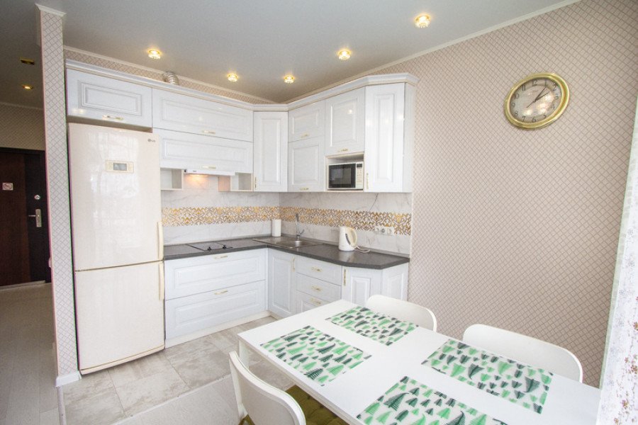 Холодильник, чайник, микроволновка и набор посуды. Для Вашего удобства — халаты, комплект полотенец и фен. Удобный односпальный диван послужит как дополнительное спальное место. Шикарный вид из окна никого не оставит равнодушным!