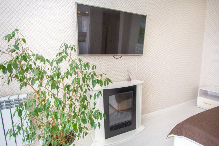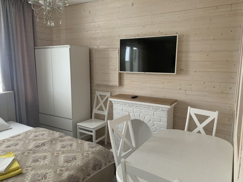 Просторная светлая студия. Оборудованная: кухней с необходимой бытовой техникой и посудой, камином и большим СМАРТ телевизором. Кондиционер для прохлады в летнею жару, и конечно же двуспальная кровать с ортопедическим матрацем.