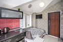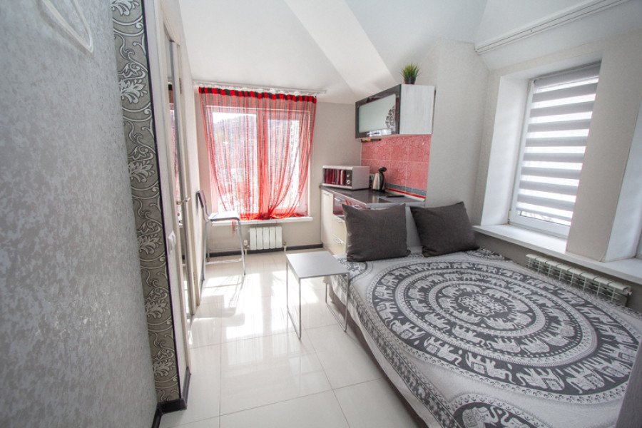Уютная одноместная студия на мансардном этаже, с небольшой кухней. Для Вашего удобства двуспальный диван, тв, чайник, микроволновка, холодильник, посуда. Сан узел с душевой, фен и средства личной гигиены.