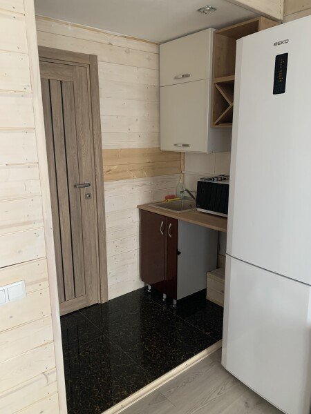 Отдельное кухонное помещение с плитой, микроволновкой, чайником, холодильником и обеденным столом и телевизором. Санузел с душевой кабиной, туалетными принадлежностями, комплектом полотенец, феном.