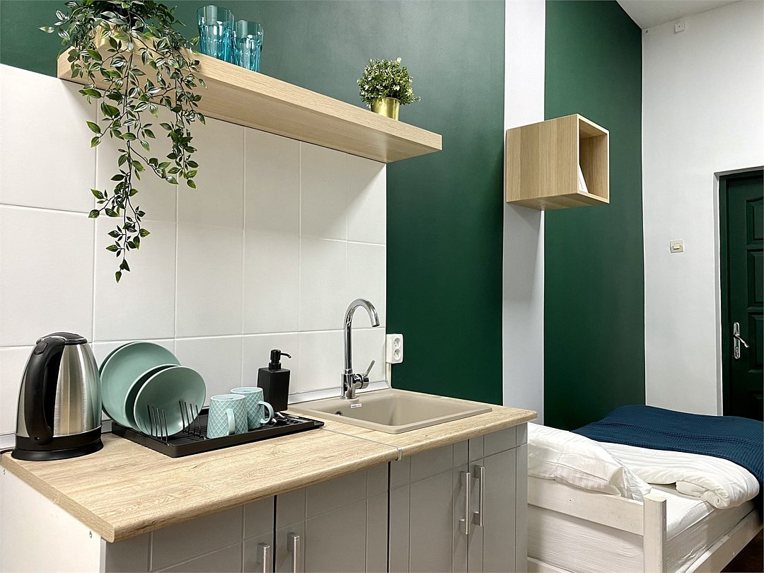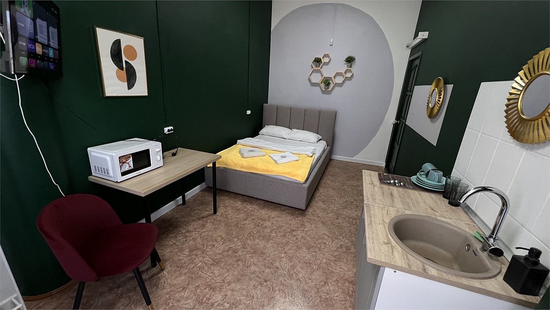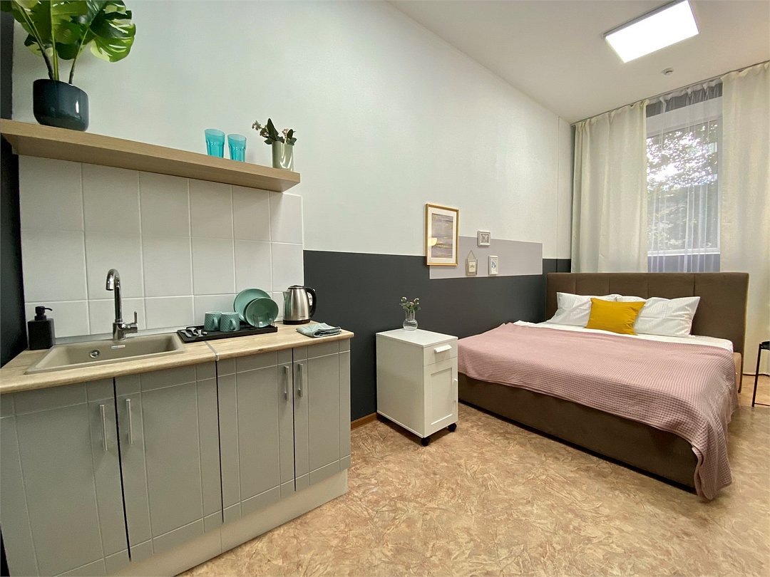 Двухместный отдельный номер с двуспальной кроватью оформлен в современном стиле с использованием теплых оттенков, создающих атмосферу уюта и комфорта. Окна выходят на тихую улицу или внутренний дворик отеля, благодаря чему в комнате всегда тихо и спокойно. Номер с мини-кухней – это удобное решение для тех, кто хочет иметь возможность быстро перекусить без необходимости выходить из номера. Рабочий стол с удобным стулом – идеальное место для работы за ноутбуком или чтения книги. Также есть бесплатный Wi-Fi. Общая ванная комната на этаже оснащена душевой кабиной, феном и комплектом туалетных принадлежностей. Мы предоставляем гостям полотенца.Услуги и удобства