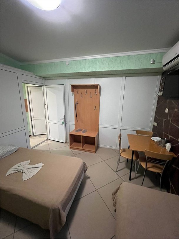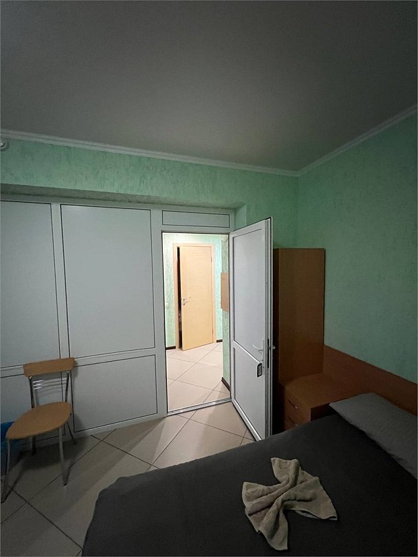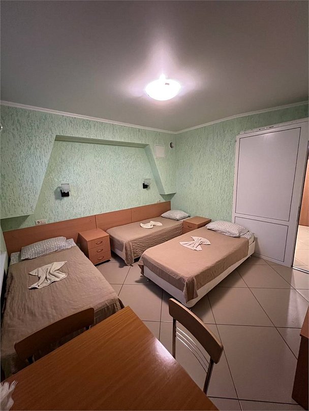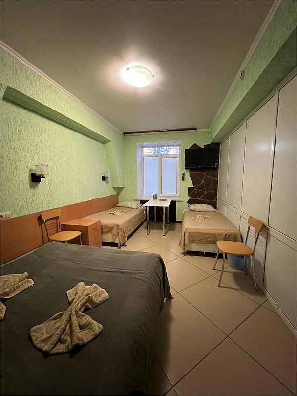 3-х местный номер, с тремя 1,5 спальными кроватями площадью 14 кВ.м., в номере комплект посуды, стол, стулья, ТВ, кондиционер, одноразовые тапочки, индивидуальные бра. Подойдет для командированных в наш город для выполнения служебных задач. Ежедневная влажная уборка, ежедневная смена полотенец. Окна во двор дома. Общий душ и туалет на 2 номера. В холле расположены холодильник и СВЧ печь.Услуги и удобства