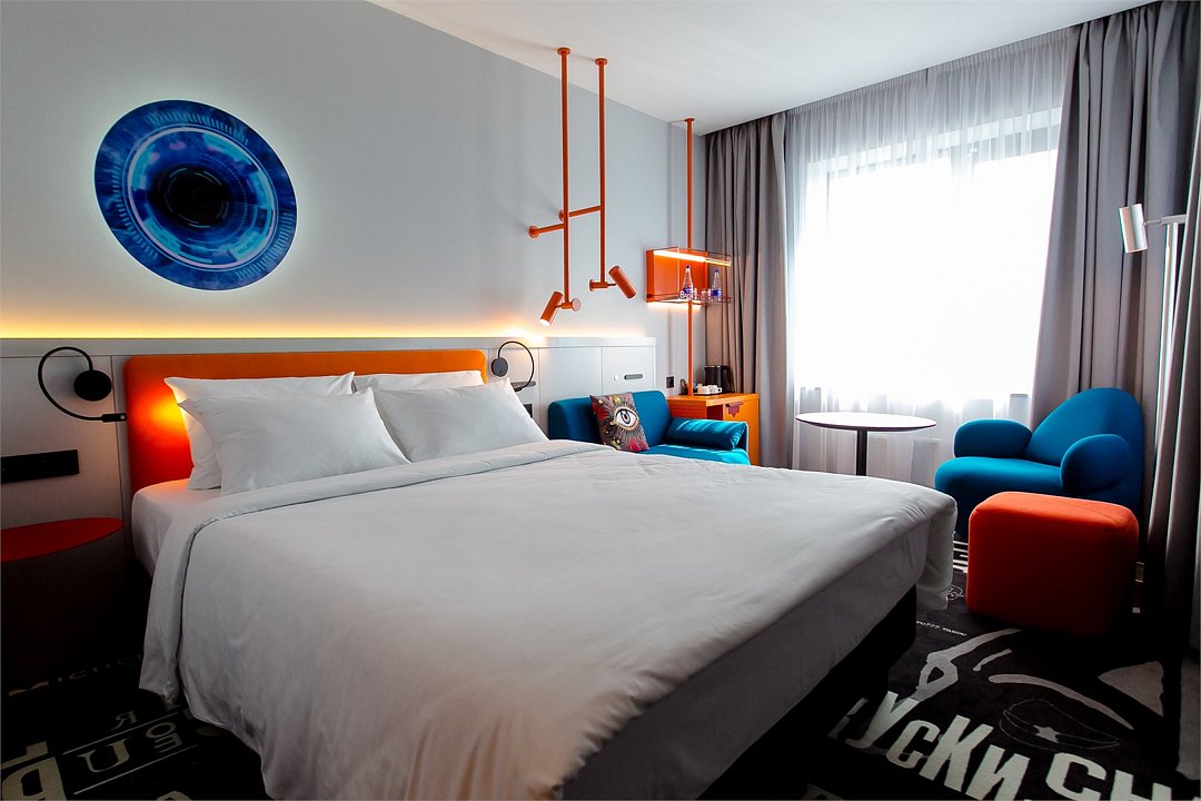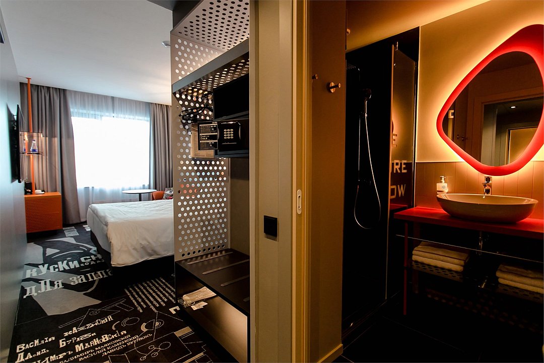 интерактивное телевидение, Wi-Fi, светильник, фен, электронные замки, душевая кабина, банные полотенца, гигиенические средства, косметические средства, двуспальная кровать, вешалки, зеркало, унитаз, раковина, ковровое покрытие, вид на город, кресло, стаканы, столовые приборы, туалетный столик, внутренний телефон, телевизор с плоским экраном, мини-холодильник, номер для некурящих, фанкойл, USB-порт, пуфик, оснащение для гостей с ограниченными возможностями, фитнес-зона, чайная станция, услуги прачечной (платно), вешалки-плечики, бутилированная вода, мини-бар (платно), мыло, затемняющая штора, зеркало в полный рост, открытый шкаф, дождевой и ручной душ, можно с питомцамиВ гостиничном номере